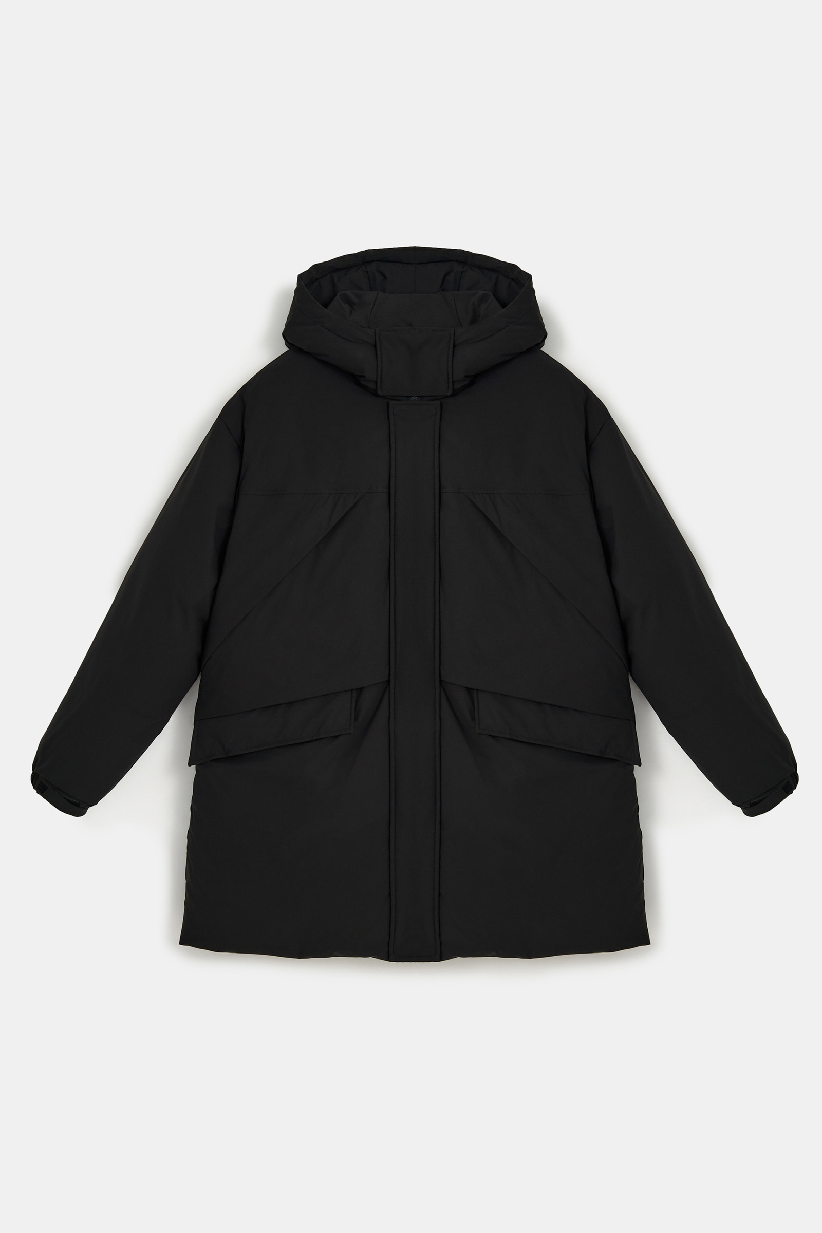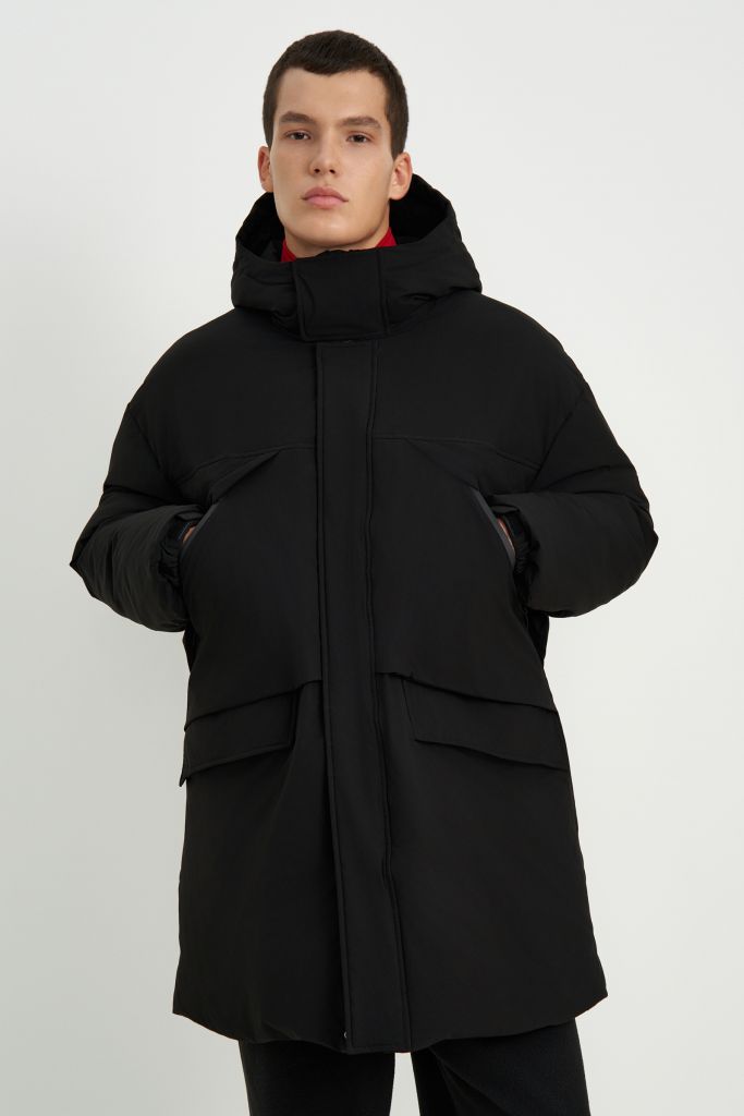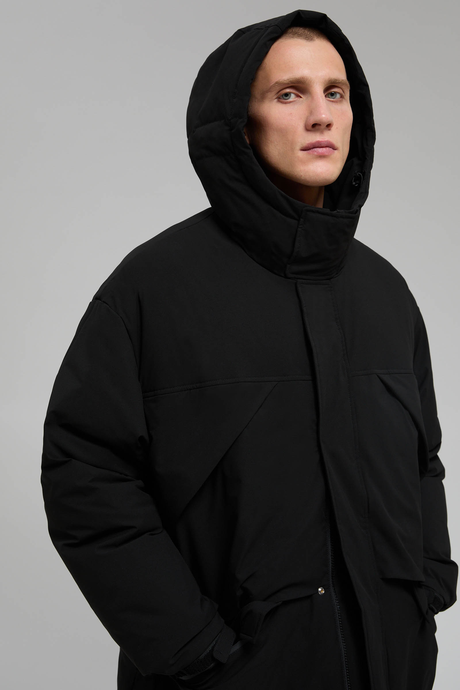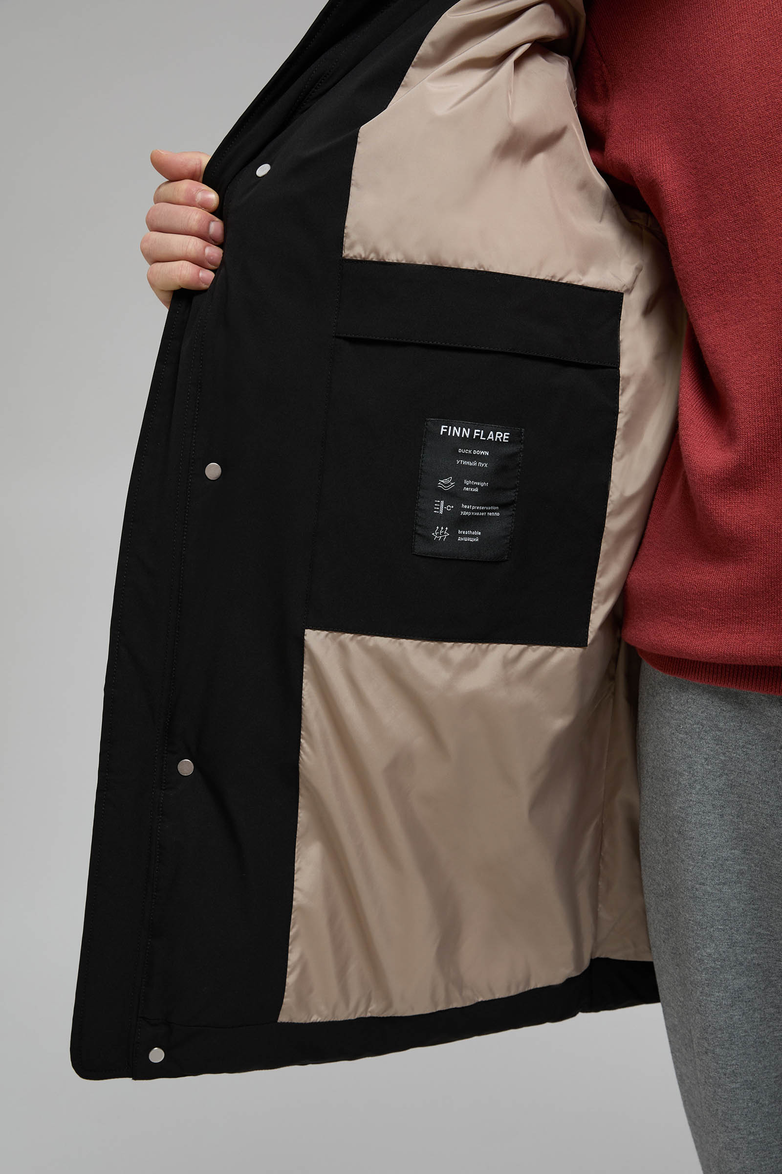 Пуховое полупальто с капюшоном и воротником-стойкой