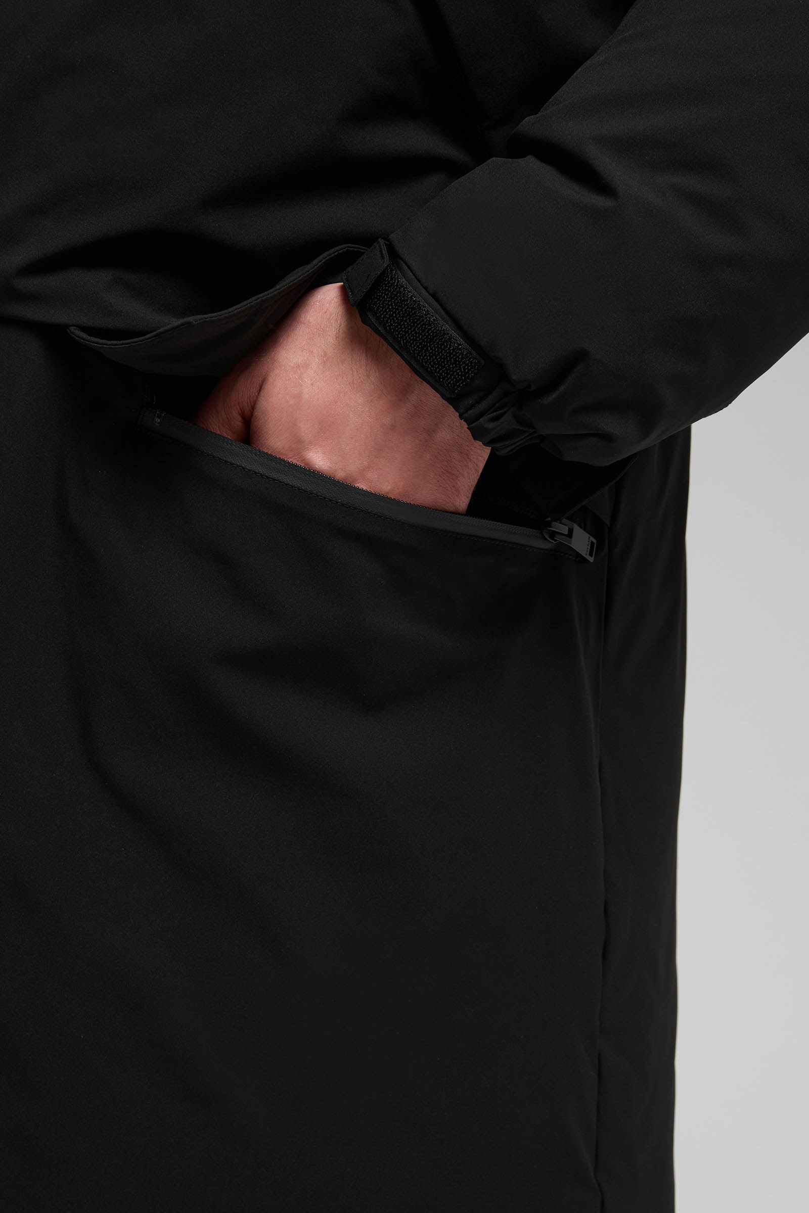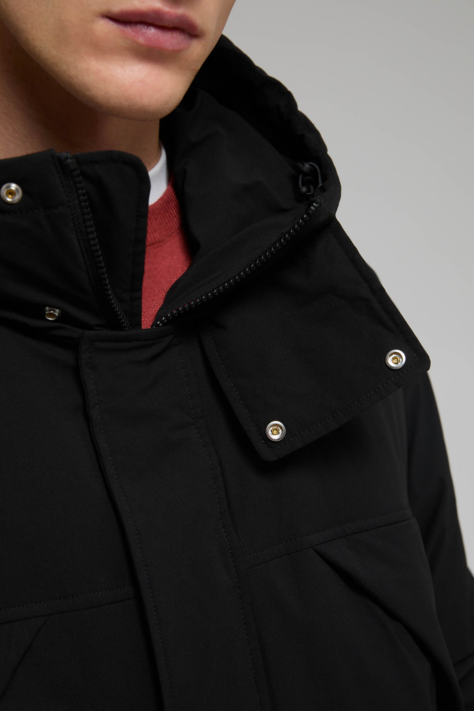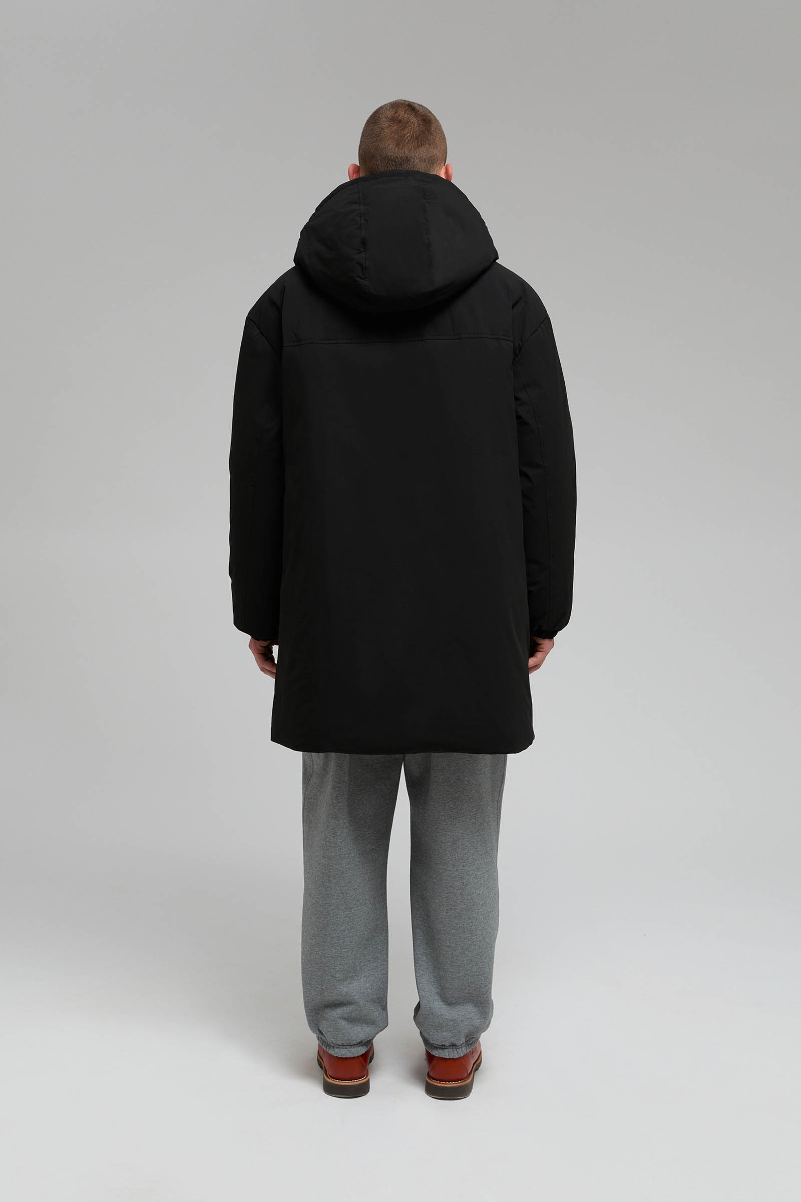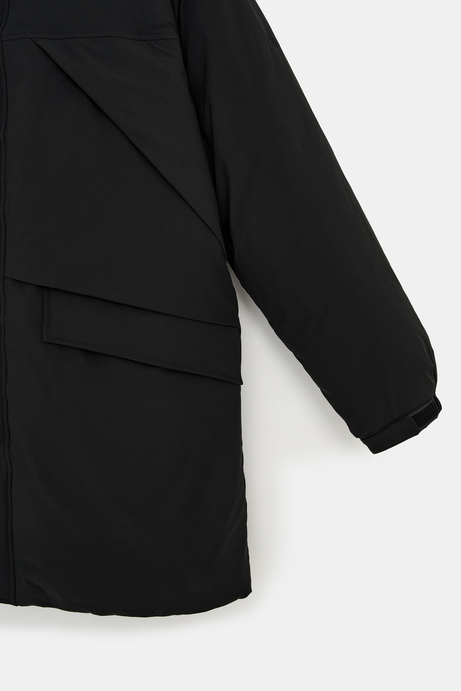 Пуховое полупальто с капюшоном и воротником-стойкой