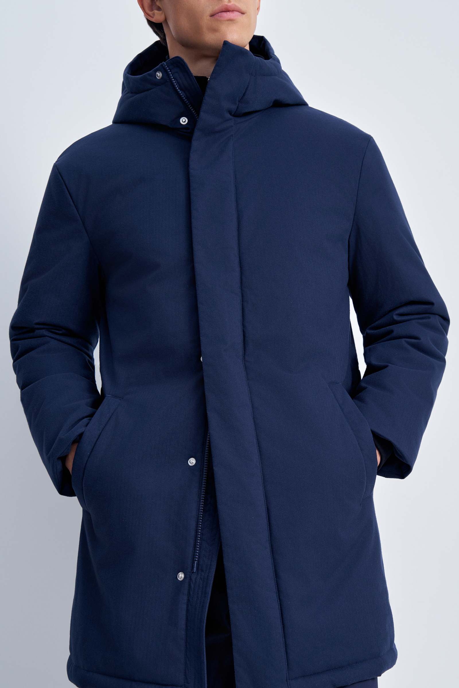 Пуховое полупальто с накладными карманами и капюшоном