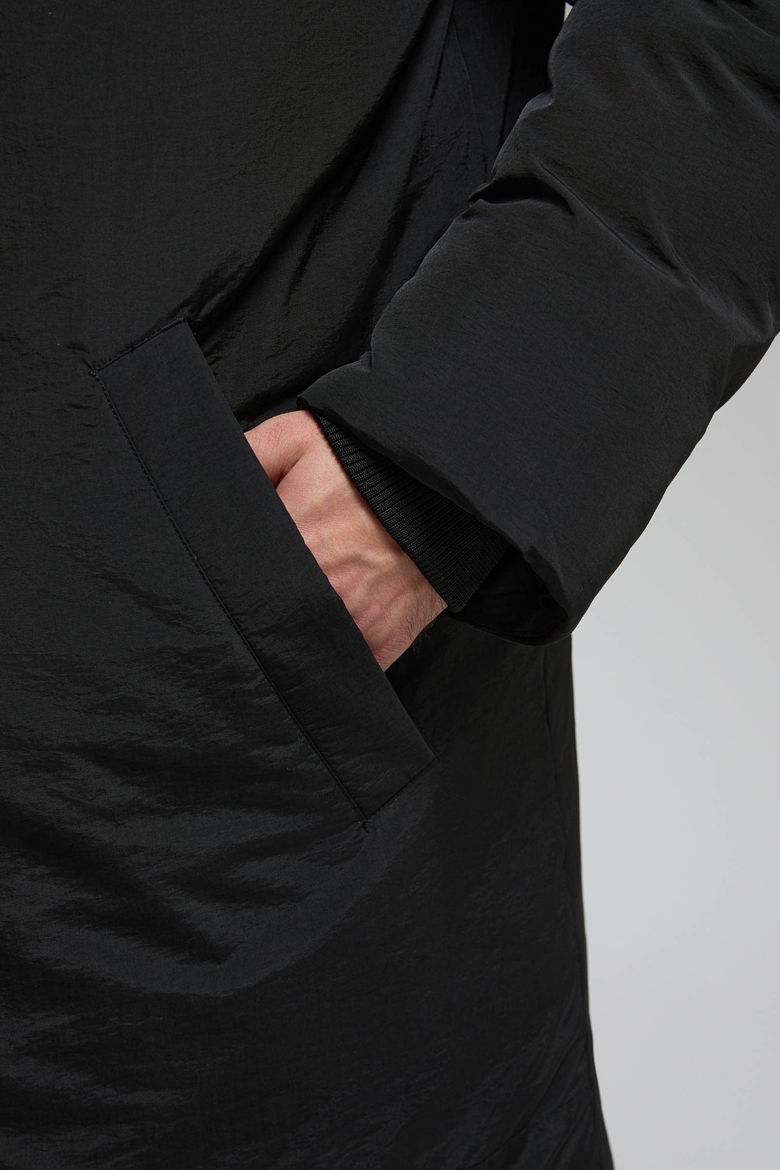 Пуховое полупальто с накладными карманами и капюшоном