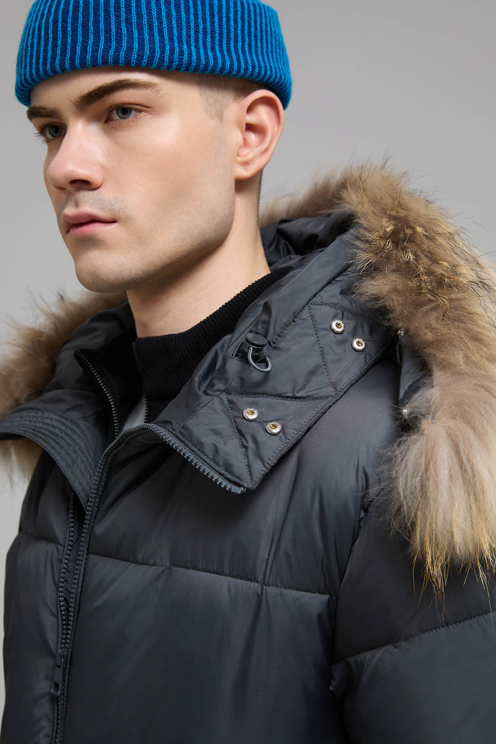 Пуховое полупальто с капюшоном и воротником-стойкой