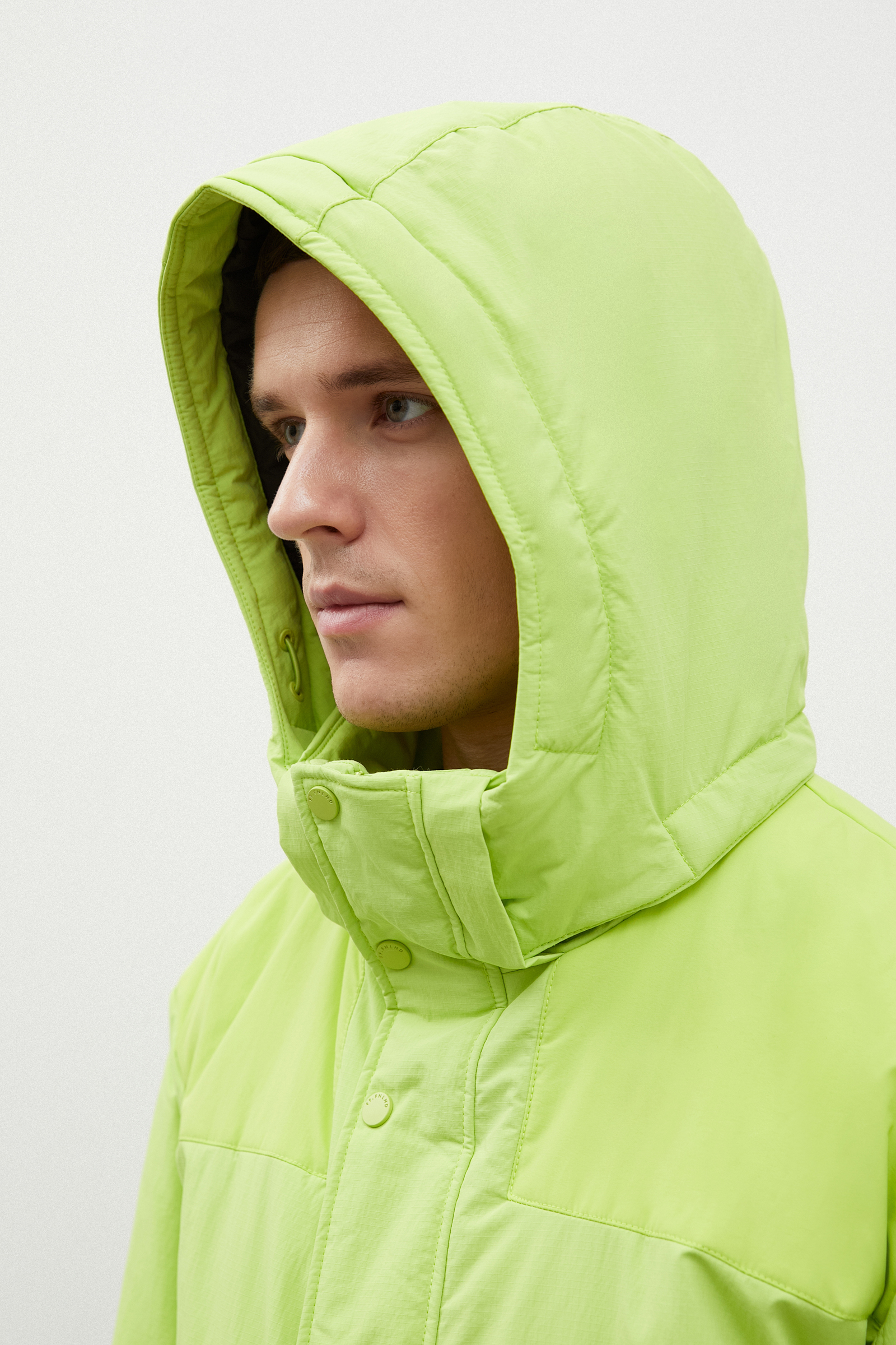 Пуховое полупальто с капюшоном и воротником-стойкой