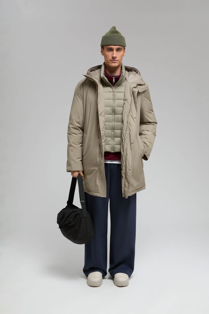 Пуховое полупальто с капюшоном и воротником-стойкой