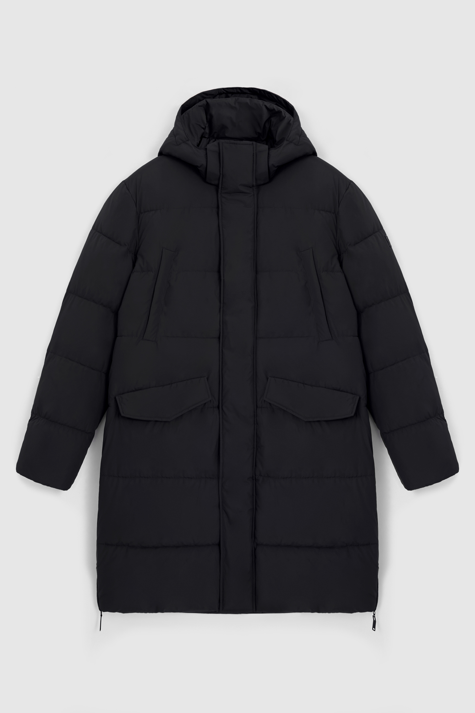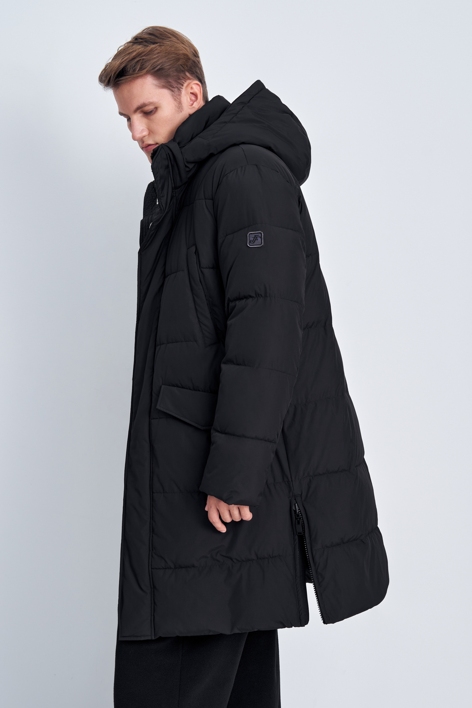 Пуховое полупальто с накладными карманами и капюшоном