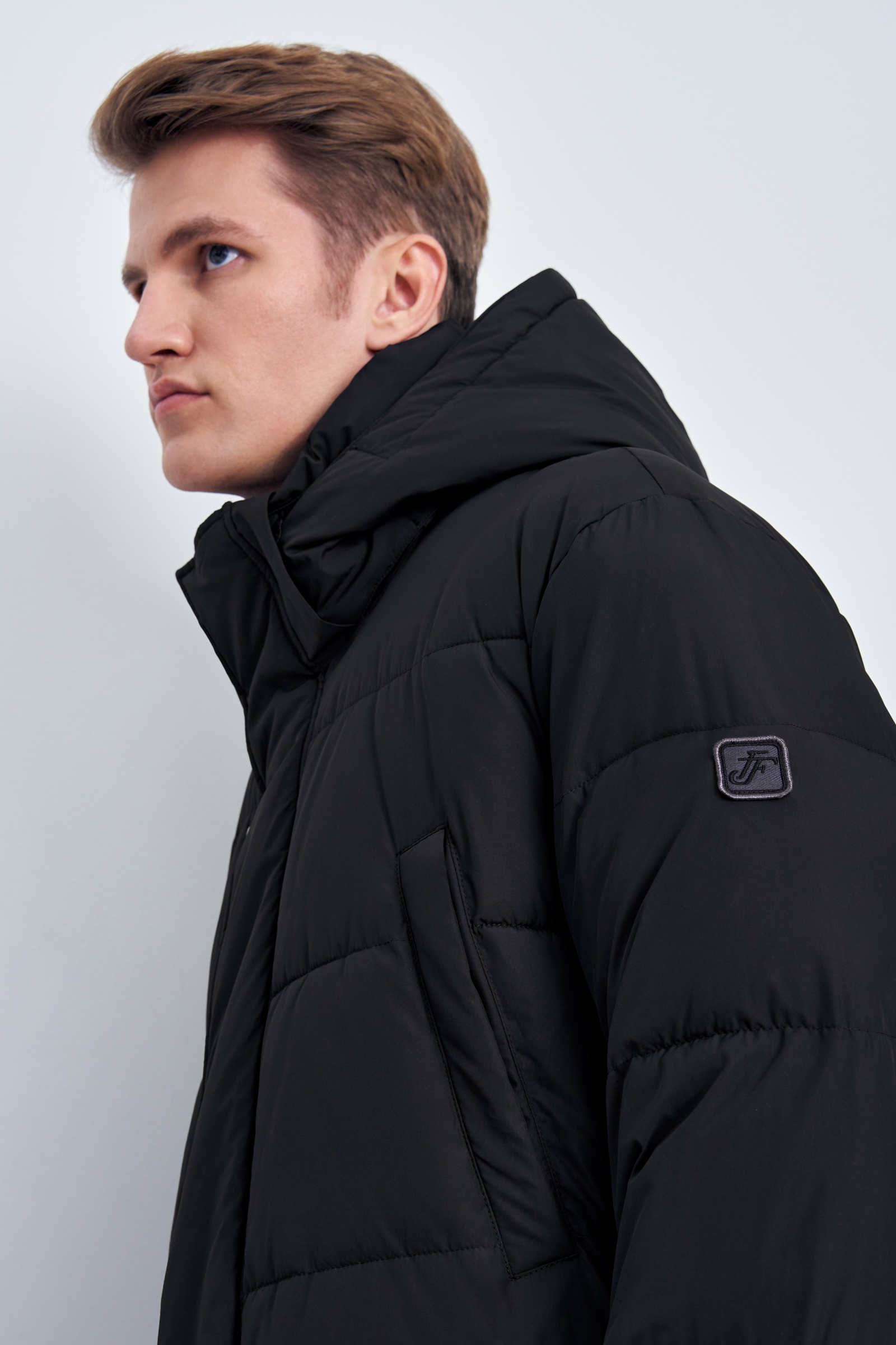 Пуховое полупальто с капюшоном и воротником-стойкой