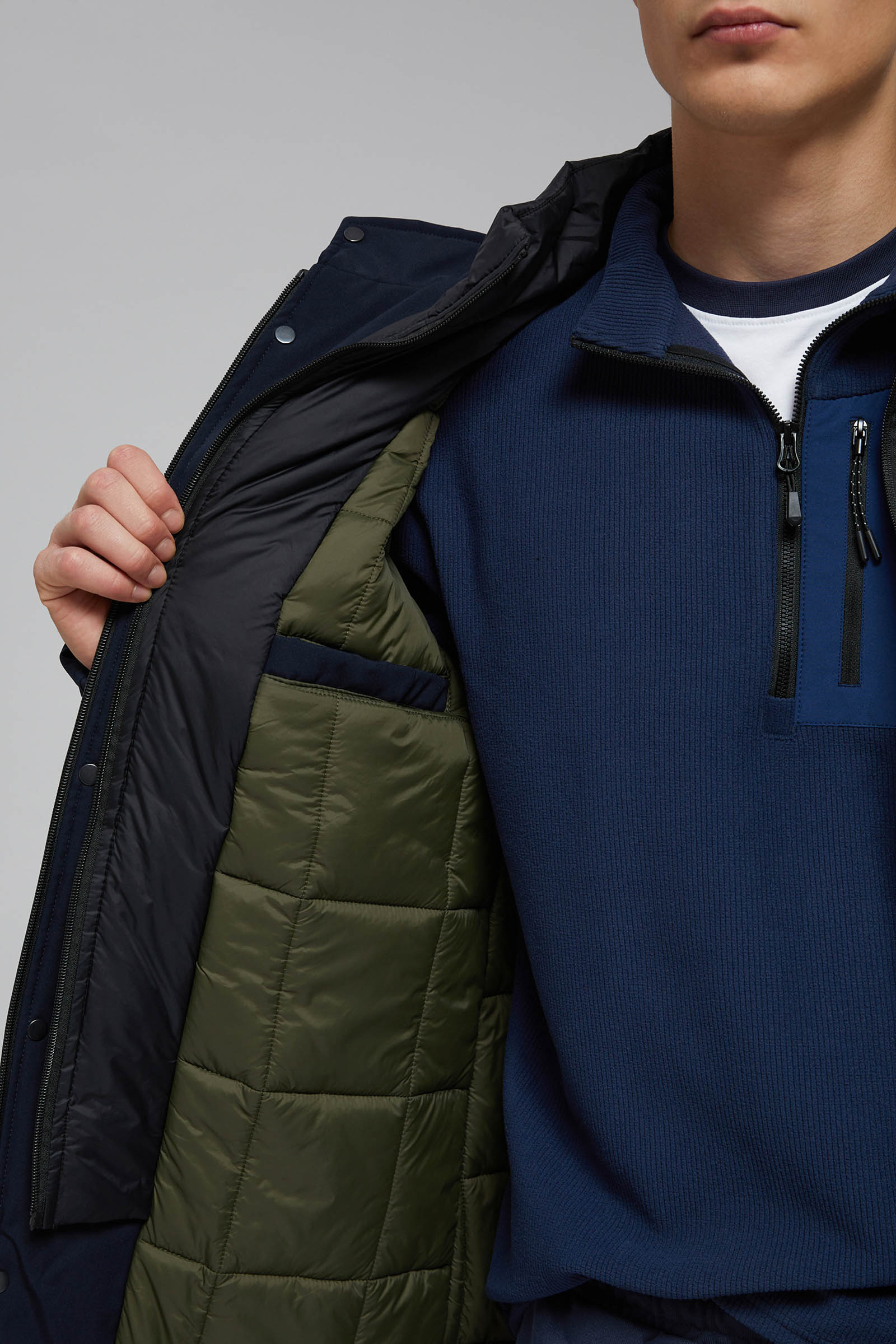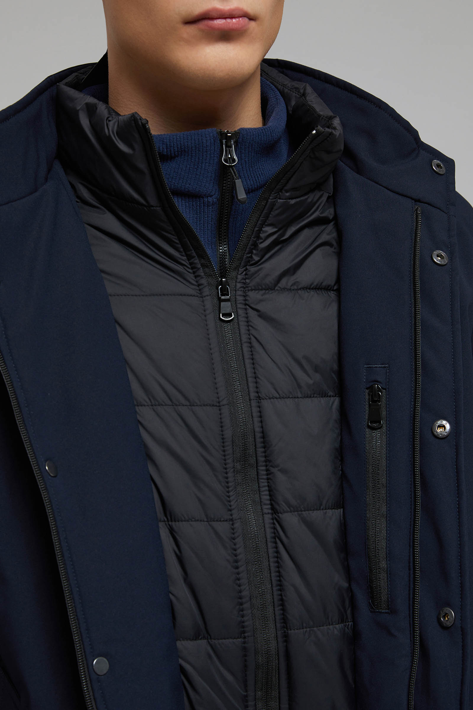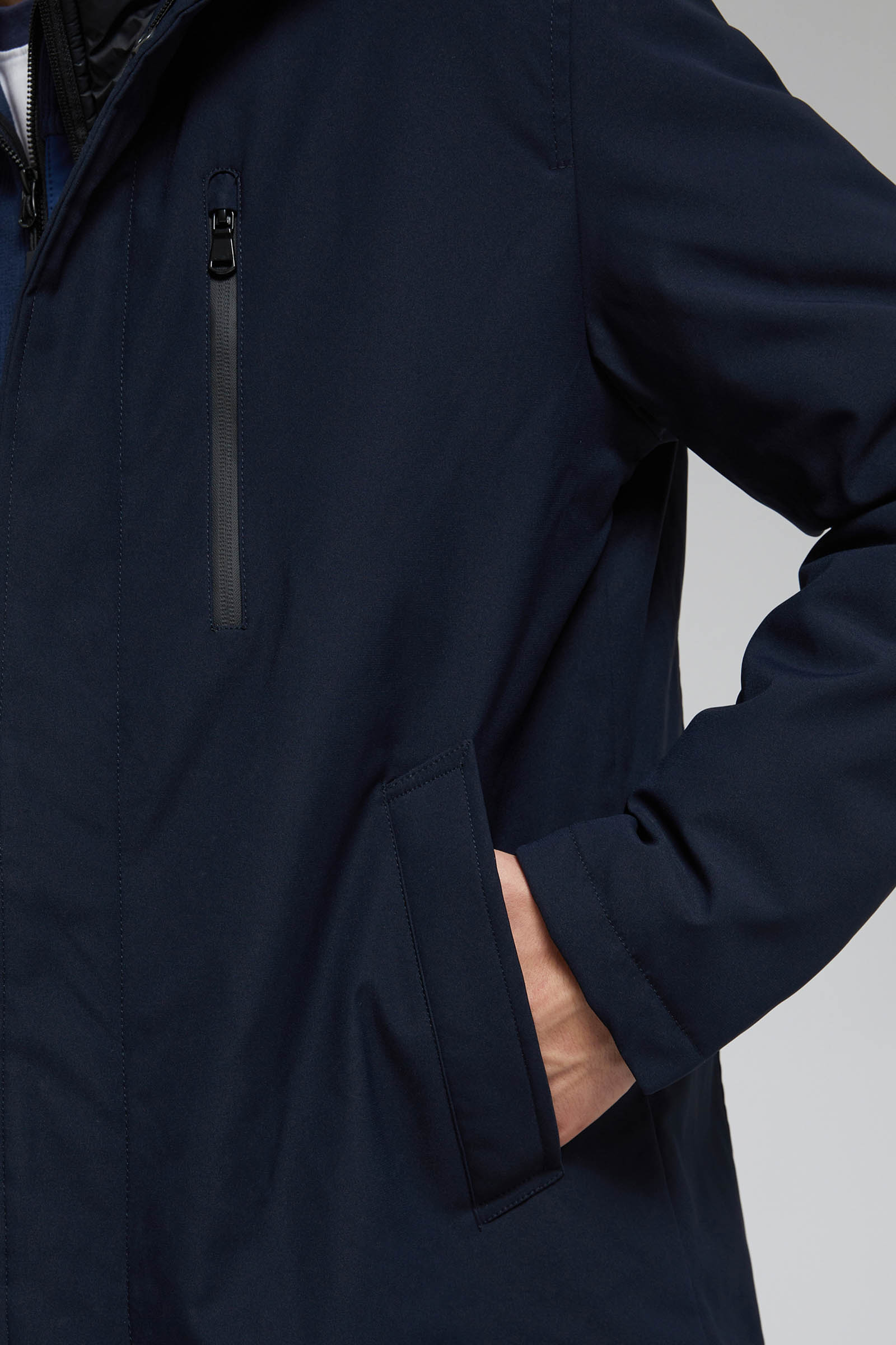 Пуховое полупальто с капюшоном и воротником-стойкой