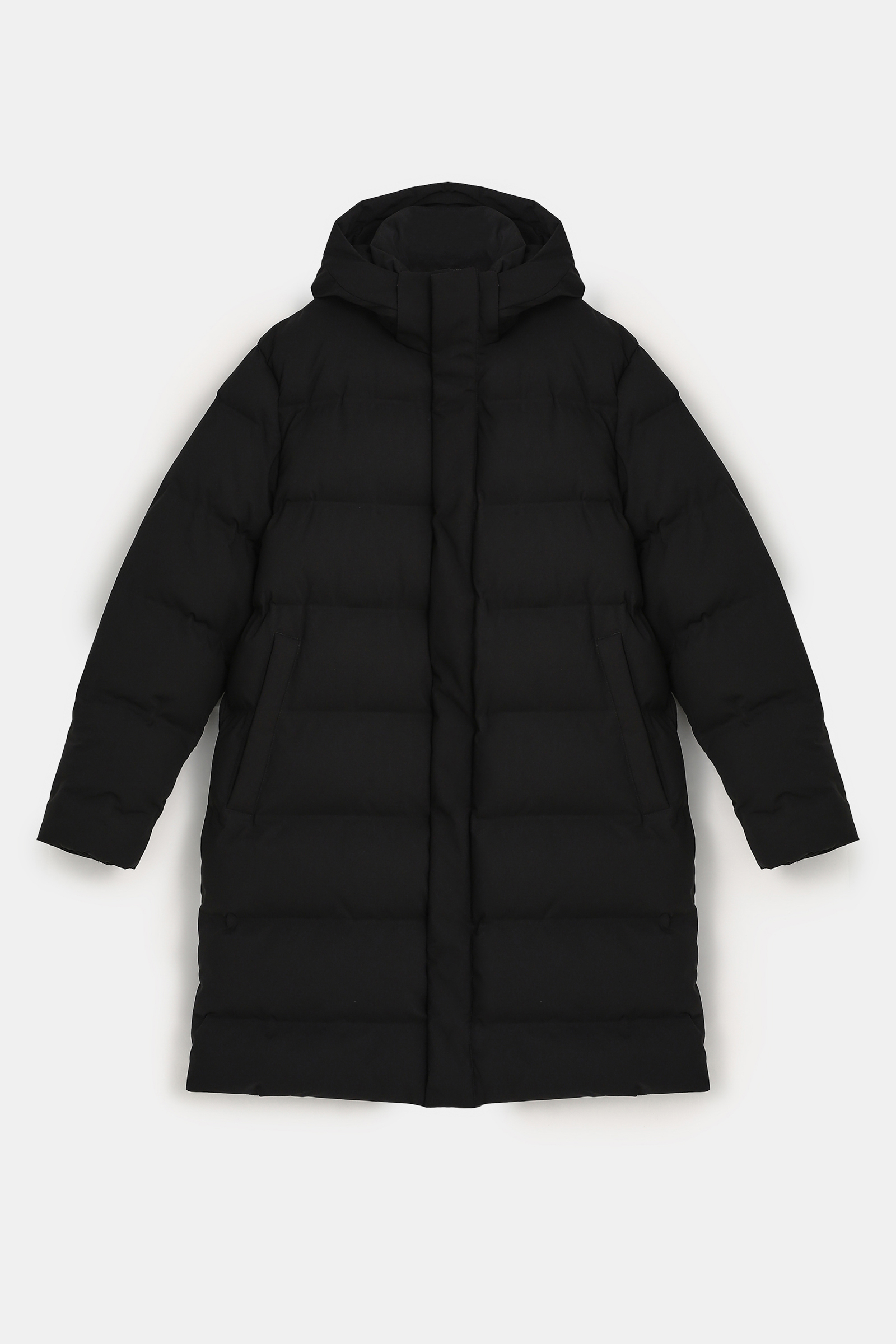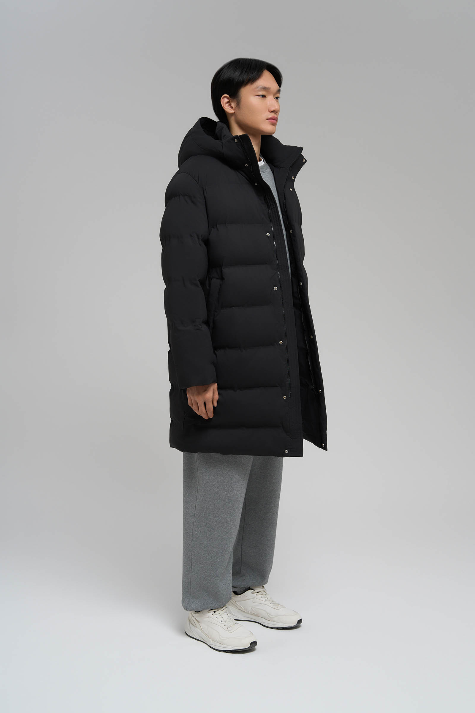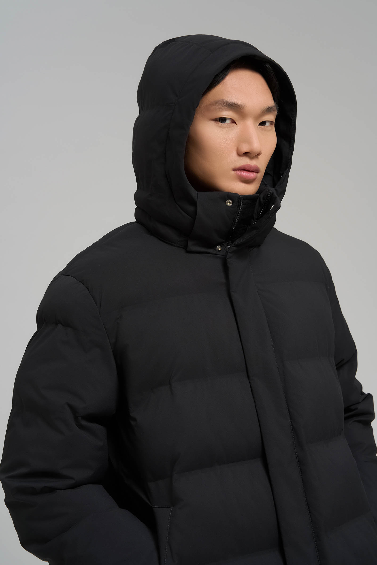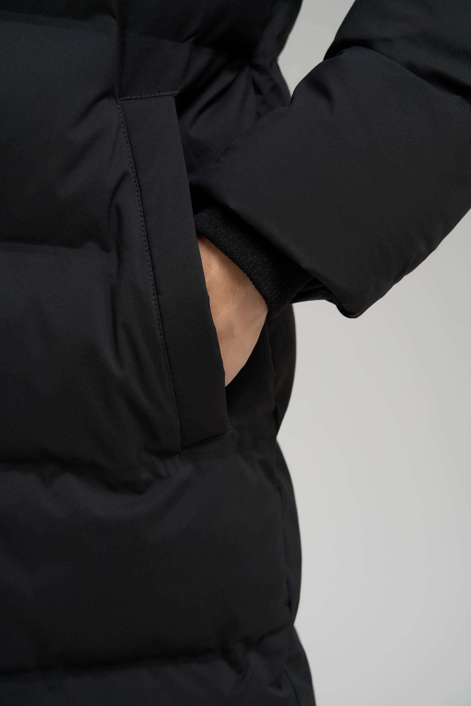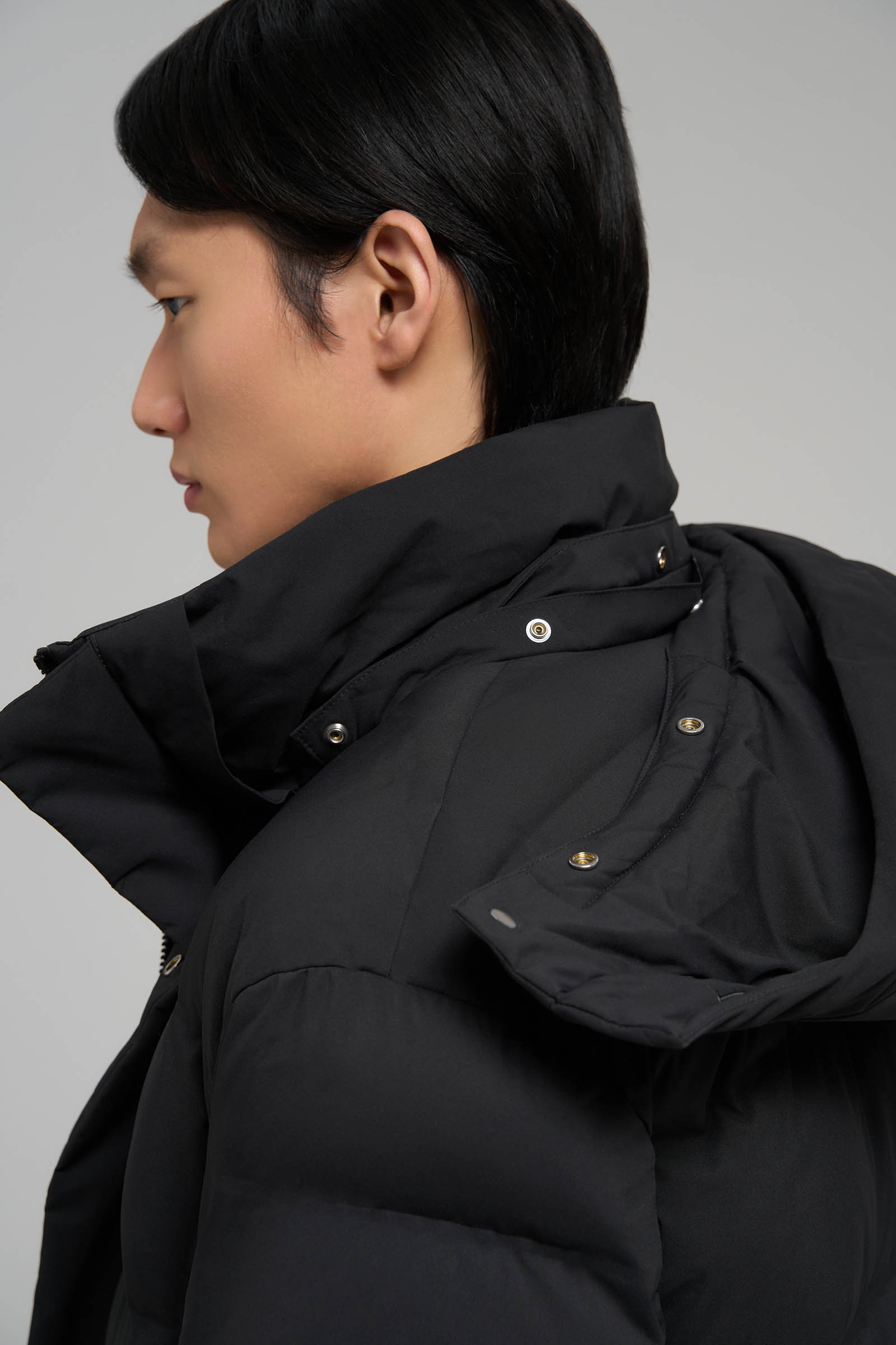 Пуховое полупальто с капюшоном и воротником-стойкой