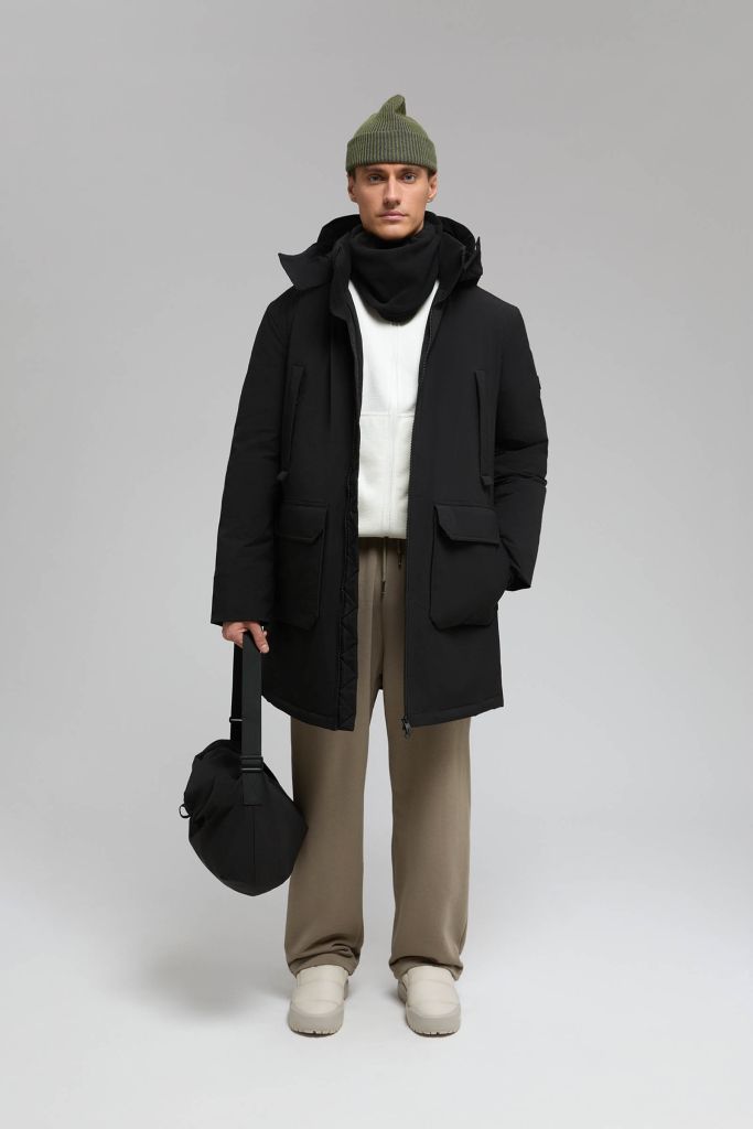 Пуховое полупальто с капюшоном и воротником-стойкой