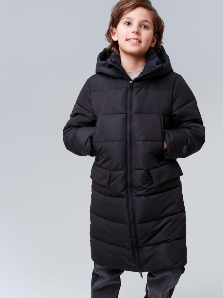Функциональный капюшон с утяжками регулируется по объёму. Карманы с надёжными застёжками позволяют носить с собой всё необходимое, не боясь потерять. Такое универсальное детское пальто для мальчиков идеально подойдёт для школьных будней, поездок и зимних прогулок.