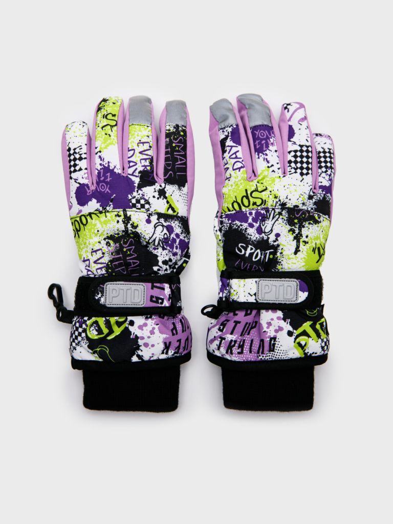 Перчатки для девочки подростка. Утепленные перчатки из мембранной ткани 5000*5000 - необходимый аксессуар для холодного времени года (осень, зима). Перчатки имеют флисовую подкладку и тесьму с карабинами, благодаря которой можно крепить перчатки друг к другу. Трикотажный манжет с защитой от снега. Специальный протектор на ладонной части усиливает износостойкость изделия и возможность регулировки ширины запястья.