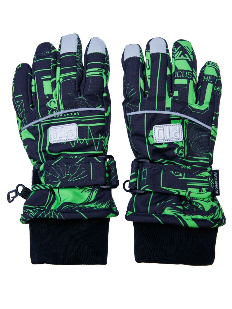 Зимние перчатки с мембраной. Утеплитель – синтепон. Мягкая ладошка из влагостойкого полиуретана. Регулируемая застёжка с липучкой по запястью. Застежка для скрепления пары между собой. Эластичный манжет. Светоотражающие элементы.