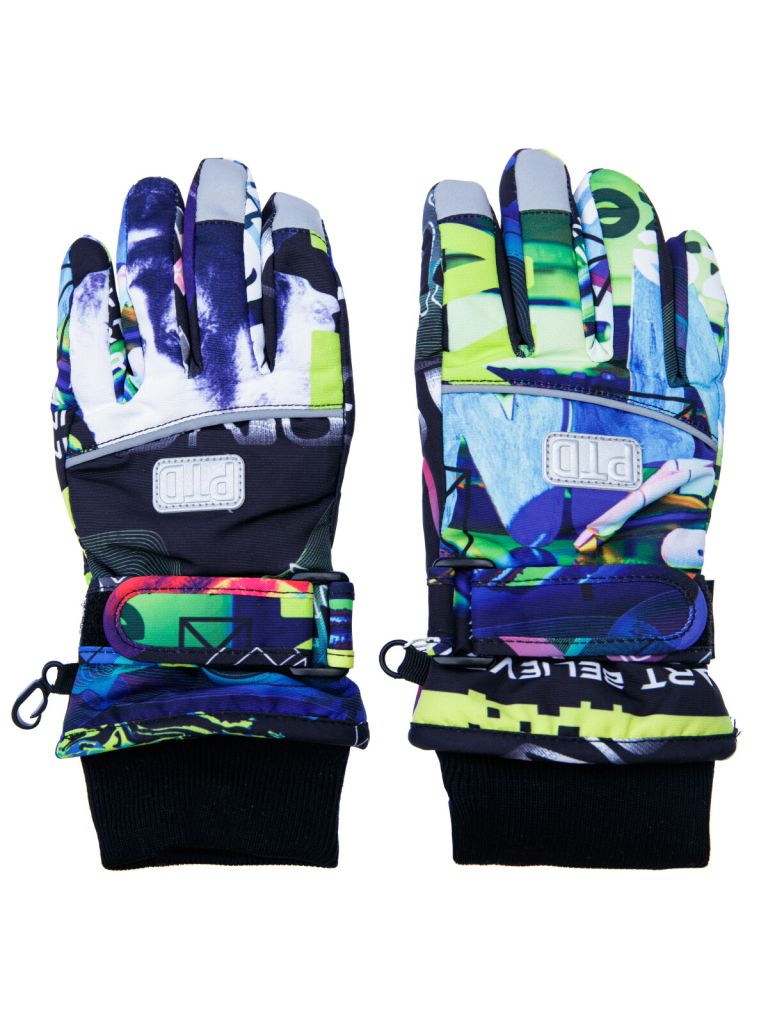 Зимние перчатки с мембраной. Утеплитель – синтепон. Мягкая ладошка из влагостойкого полиуретана. Регулируемая застёжка с липучкой по запястью. Застежка для скрепления пары между собой. Эластичный манжет. Светоотражающие элементы.
