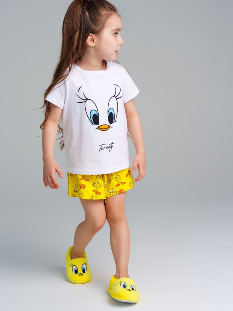Пижама: футболка, шорты из качественного и приятного на ощупь трикотажа джерси. Высокое содержание хлопка 95%. Благодаря наличию эластана в составе ткани изделие проще в уходе и держит форму. Эластичный пояс со шнурком.