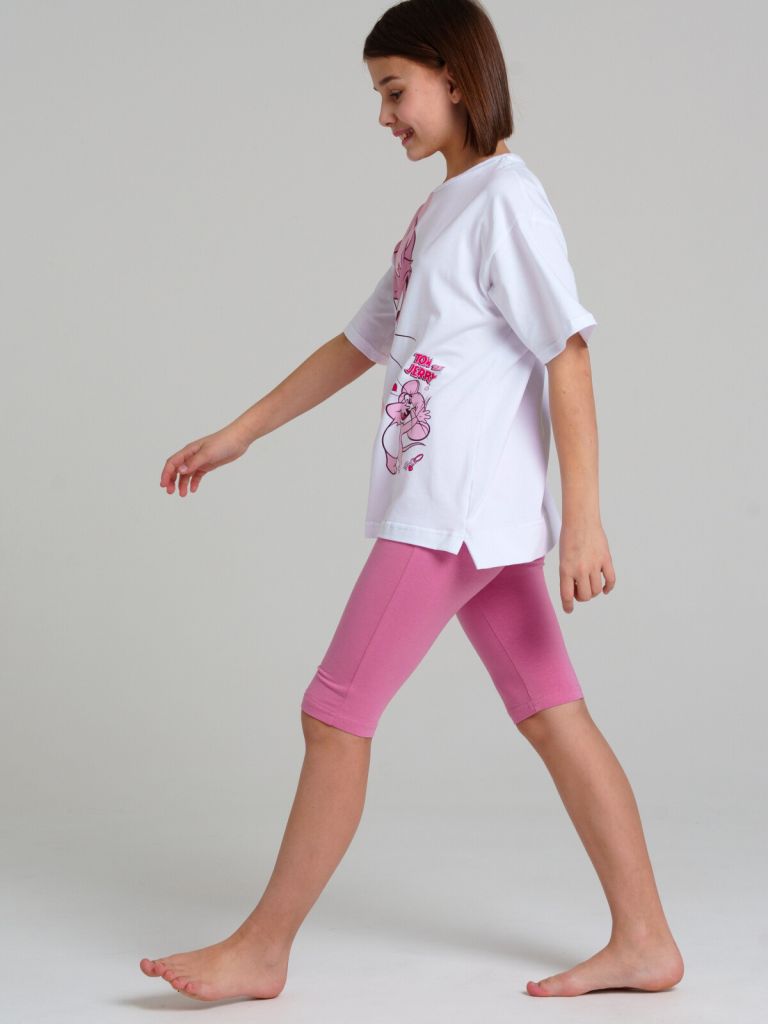 Пижама: футболка oversize, брюки с высоким содержанием хлопка. Благодаря наличию эластана в составе ткани, изделие проще в уходе и держит форму. Брюки классического прямого кроя. Эластичный пояс с тесьмой позволяет легко надевать брюки и утягивать до комфортной посадки.