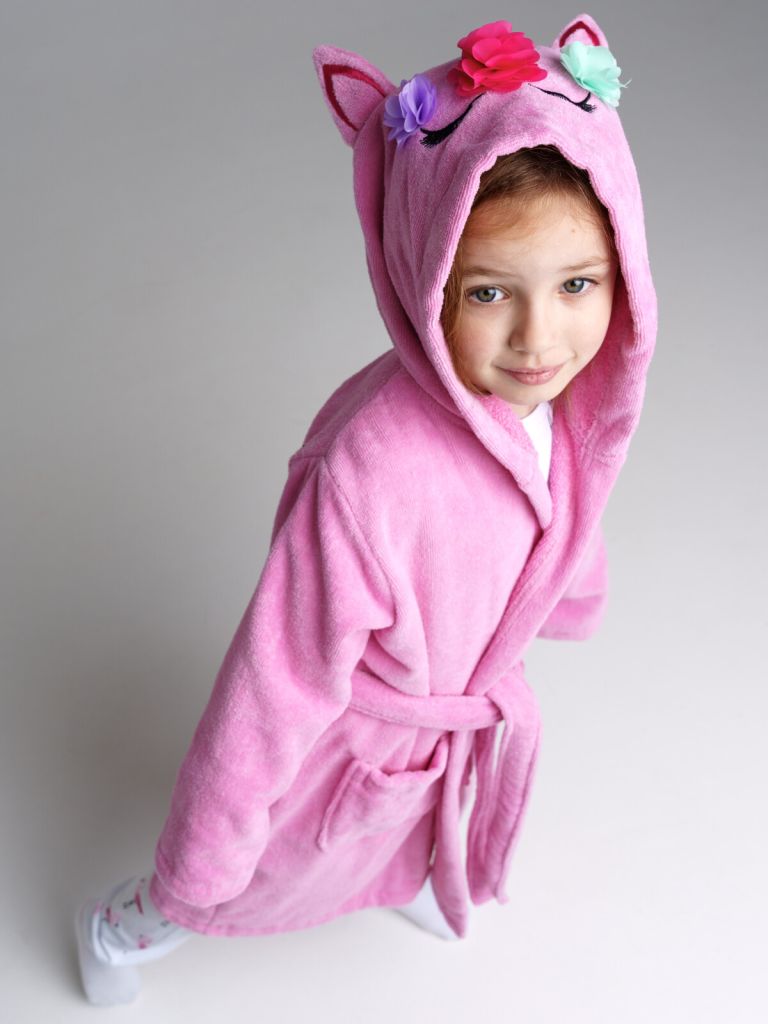 Мягкий и уютный махровый халат из высококачественного полотна. 100% натуральный хлопок. Отлично впитывает влагу и позволяет коже дышать. Пришитый пояс, по спинке резинка. Декорированный капюшон.