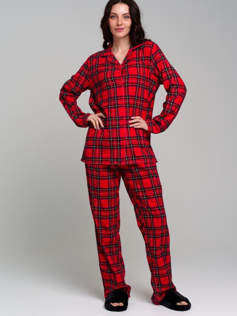 Пижама текстильная взрослых размеров: можно составить family look c детским вариантом пижамы аналогичного дизайна. 100% хлопок. Фланель - мягкая, приятная к телу ткань с небольшим начесом. Застежка на пуговицы. Карманы в брюках. Эластичный пояс с тесьмой позволяет легко надевать брюки и утягивать до комфортной посадки.