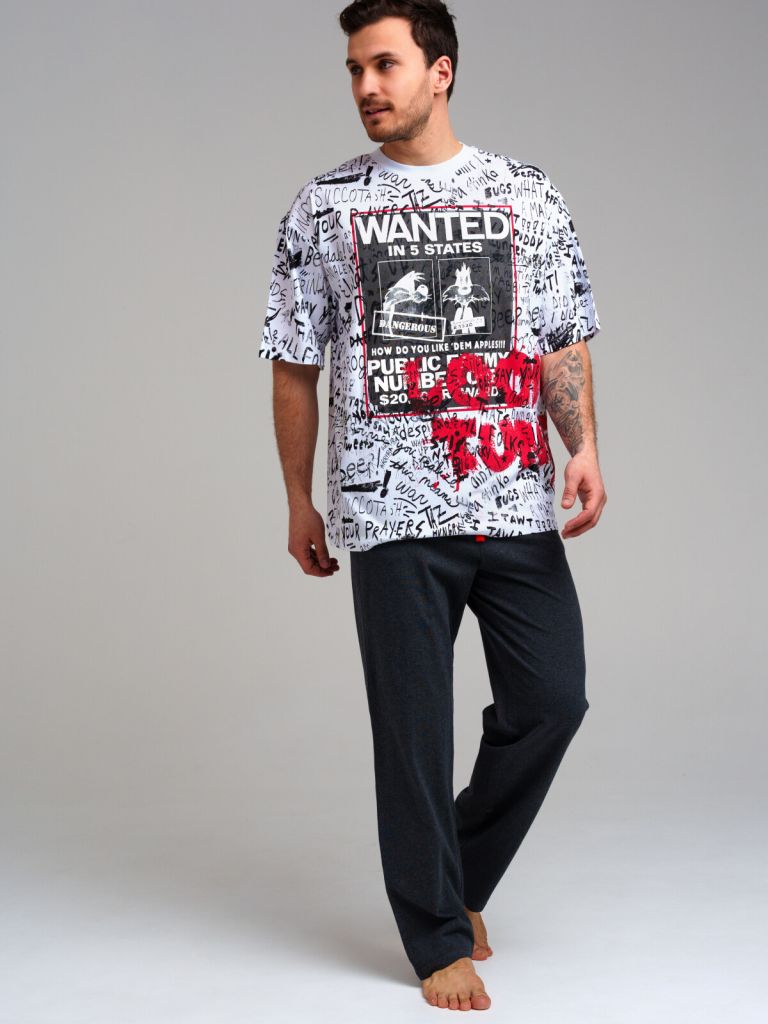 Пижама из качественного и приятного на ощупь трикотажа джерси. 100% хлопок. Футболка силуэта oversize. Брюки comfort fit - свободный крой. Эластичный пояс со шнурком. Карманы в боковых швах.
