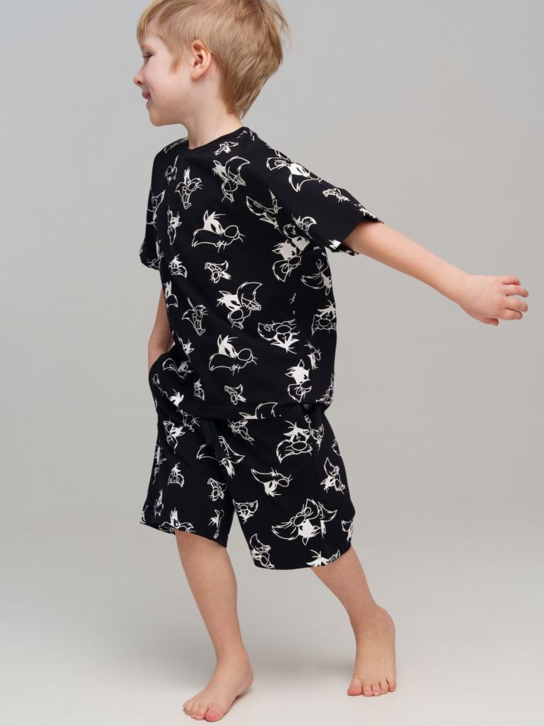 Пижама детская для мальчика. Футболка и шорты из эластичного и приятного на ощупь трикотажа. Шорты на резинке со шнурком. Шорты с карманами в боковых швах. Высокое содержание хлопка 95%. Благодаря наличию эластана в составе ткани изделие держит форму и меньше мнется.