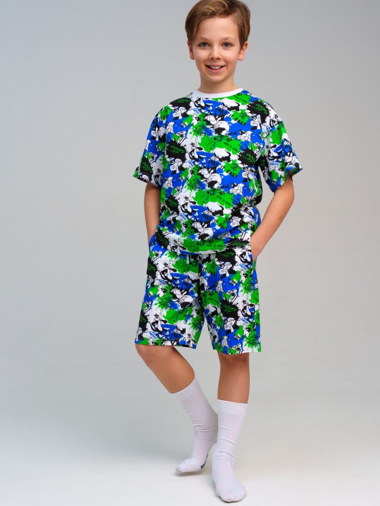 Пижама для мальчика подростка. Футболка и шорты из эластичного и приятного на ощупь трикотажа. Шорты на резинке со шнурком. Высокое содержание хлопка 95%. Благодаря наличию эластана в составе ткани изделие держит форму и меньше мнется.