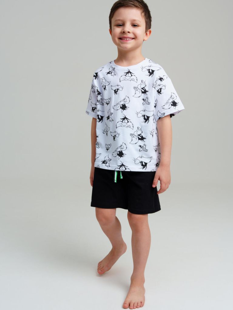 Пижама детская для мальчика. Футболка и шорты из эластичного и приятного на ощупь трикотажа. Шорты на резинке со шнурком. Шорты с карманами в боковых швах. Высокое содержание хлопка 95%. Благодаря наличию эластана в составе ткани изделие держит форму и меньше мнется.
