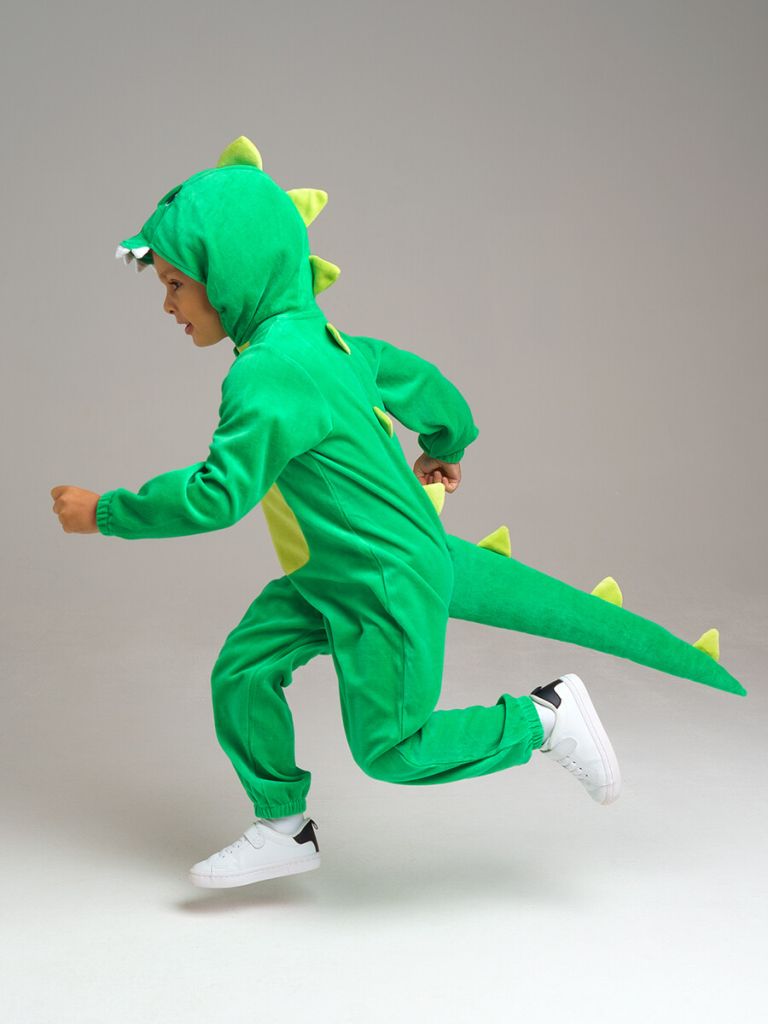 Оригинальный комбинезон динозавр. Выполнен из приятного на ощупь, мягкого велюра. Высокое содержание хлопка 75%. Не сковывает движения, сохраняет форму, не садится и не вытягивается. Спереди застежка на молнию. Текстильный клапан для защиты подбородка, а также внутренняя защитная планка. Универсальный дизайн идеально подходит и девочкам, и мальчикам.