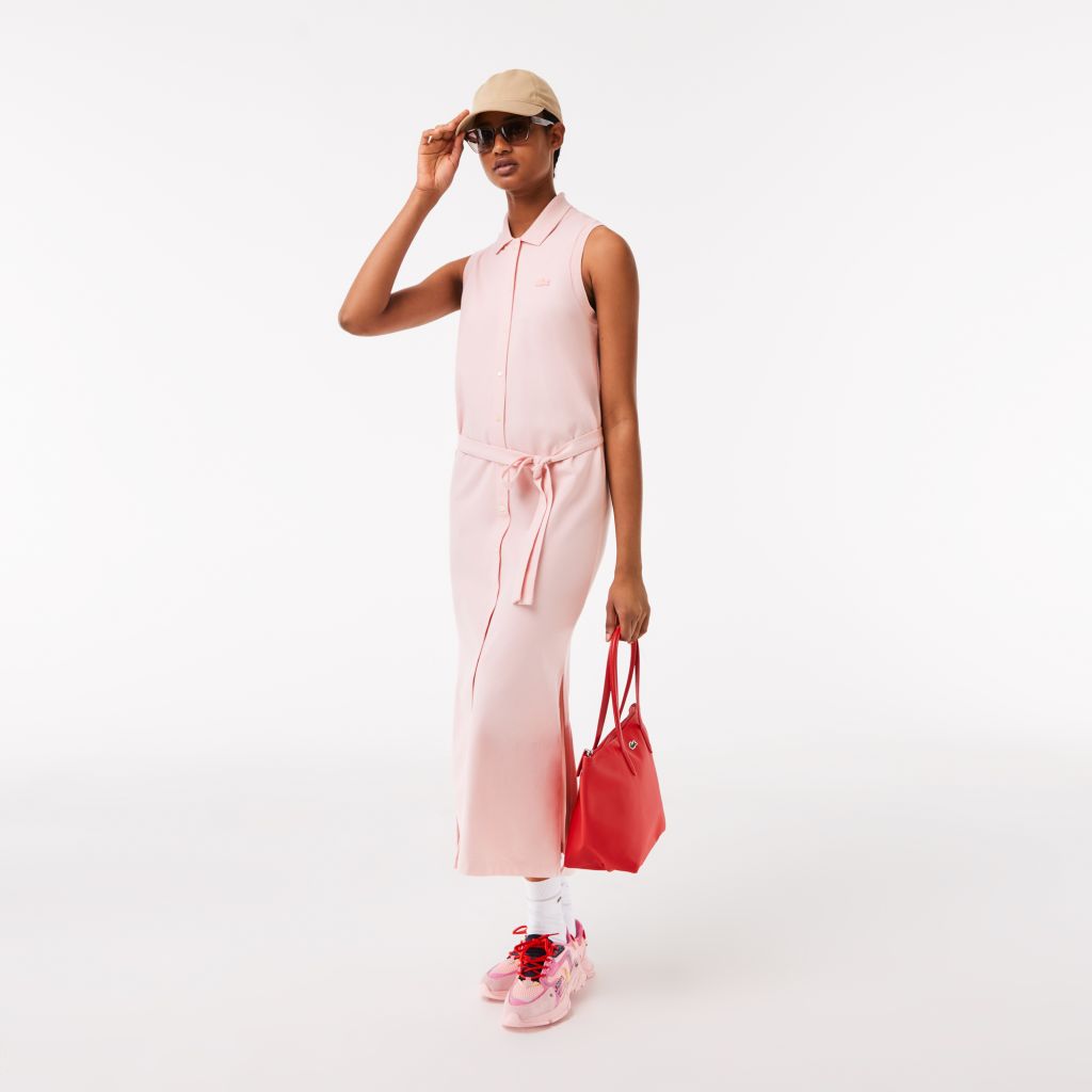 Длинное стрейчевое платье-поло Petit Piqu? \ Стрейчевое хлопковое платье-поло \ Обычный прямой крой \ Пояс-завязка на талии \ Пуговицы из натурального перламутра \ Вышитый логотип на груди \ Воротник-поло с застежкой на перламутровые пуговицы\Мини-хлопк...
