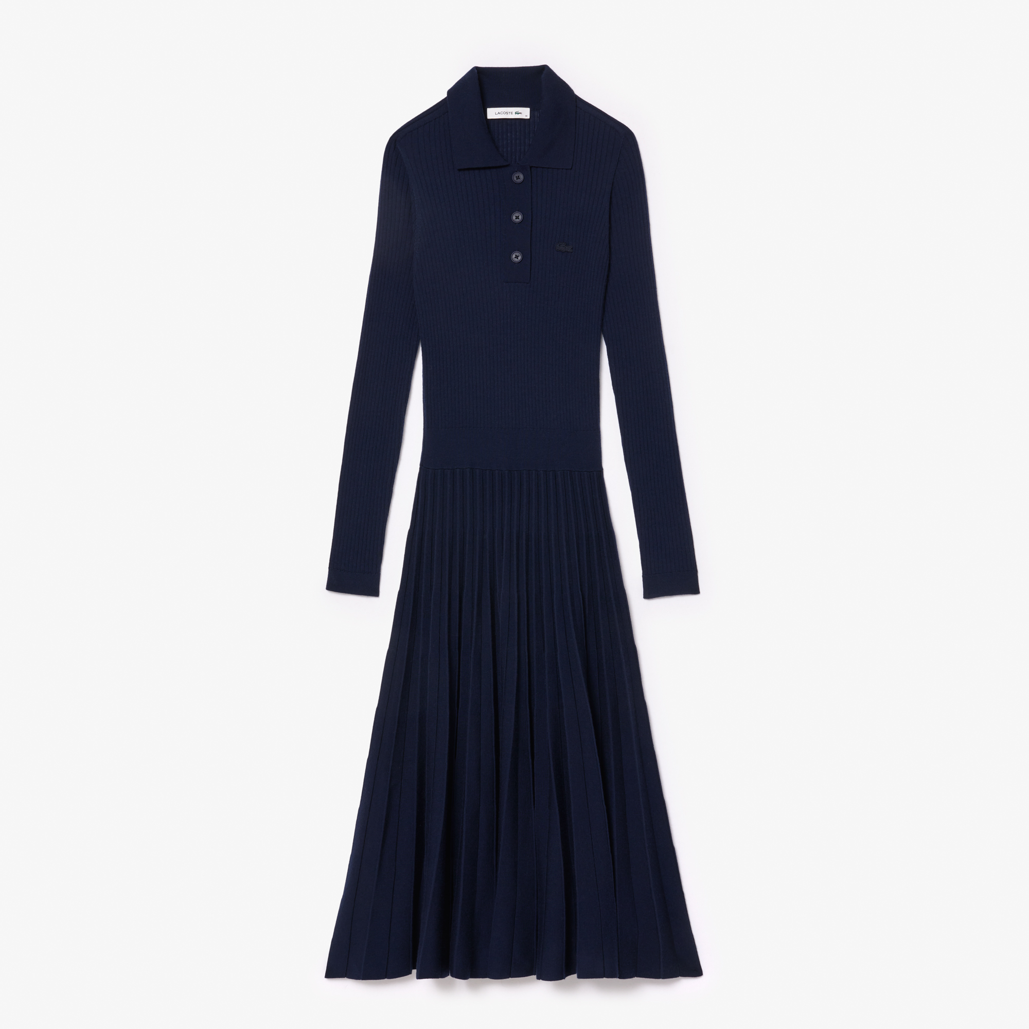 Шерстяное платье в рубчик с длинными рукавами \ Шерсть из источников, соответствующих строгим стандартам защиты животных \ Воротник-поло, вдохновленный оригинальным L.12.12 \ Узкие складки на юбке \ Лента-пуговица с резинкой в 3 тона \ Вышитый логотип на