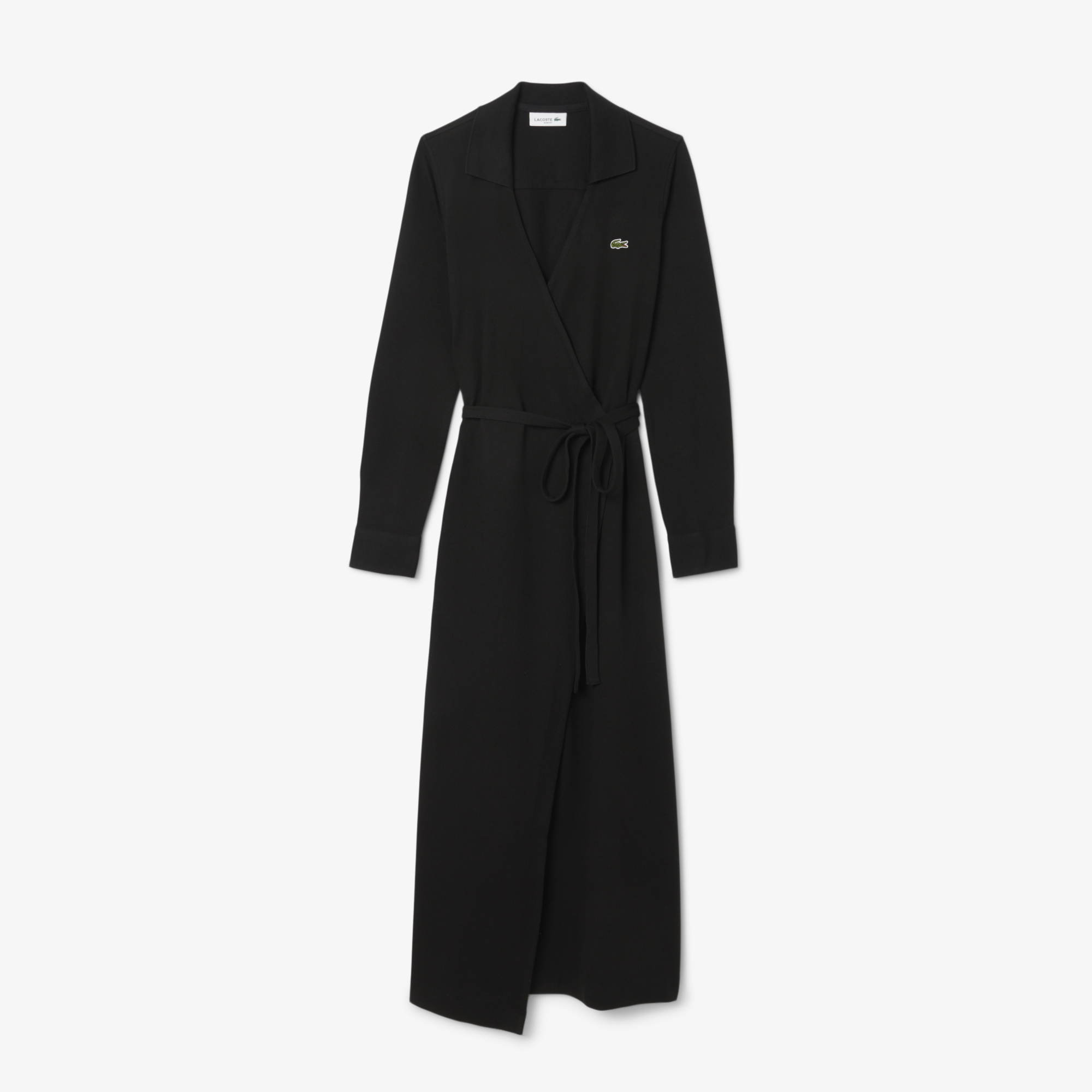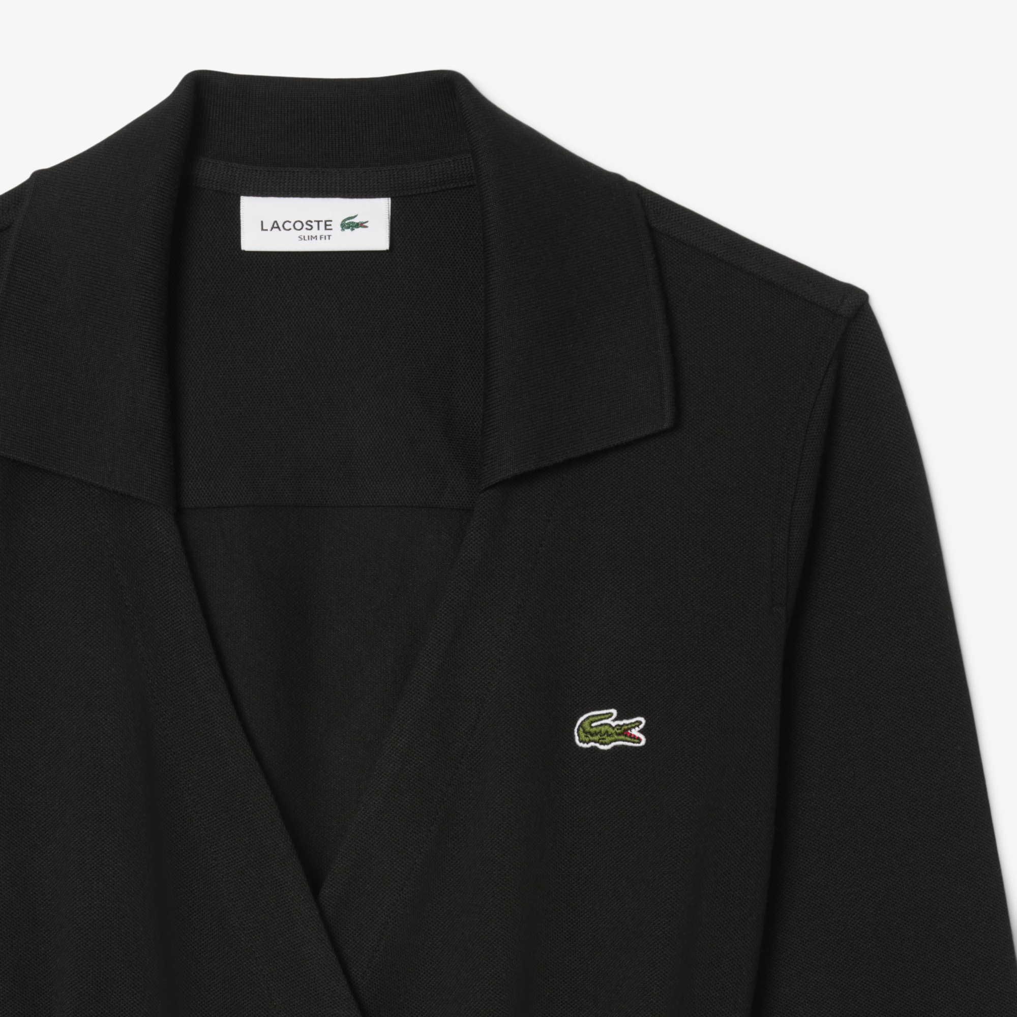 Приталенное платье-поло с запахом \ Эластичный хлопковый пике \ Приталенный крой \ Пуговицы из натурального перламутра на рукавах \ Открытый воротник в рубчик \ Вышитый логотип на груди \ Общая длина платья: 48 дюймов / 122 см для размера 36 \ Материал: