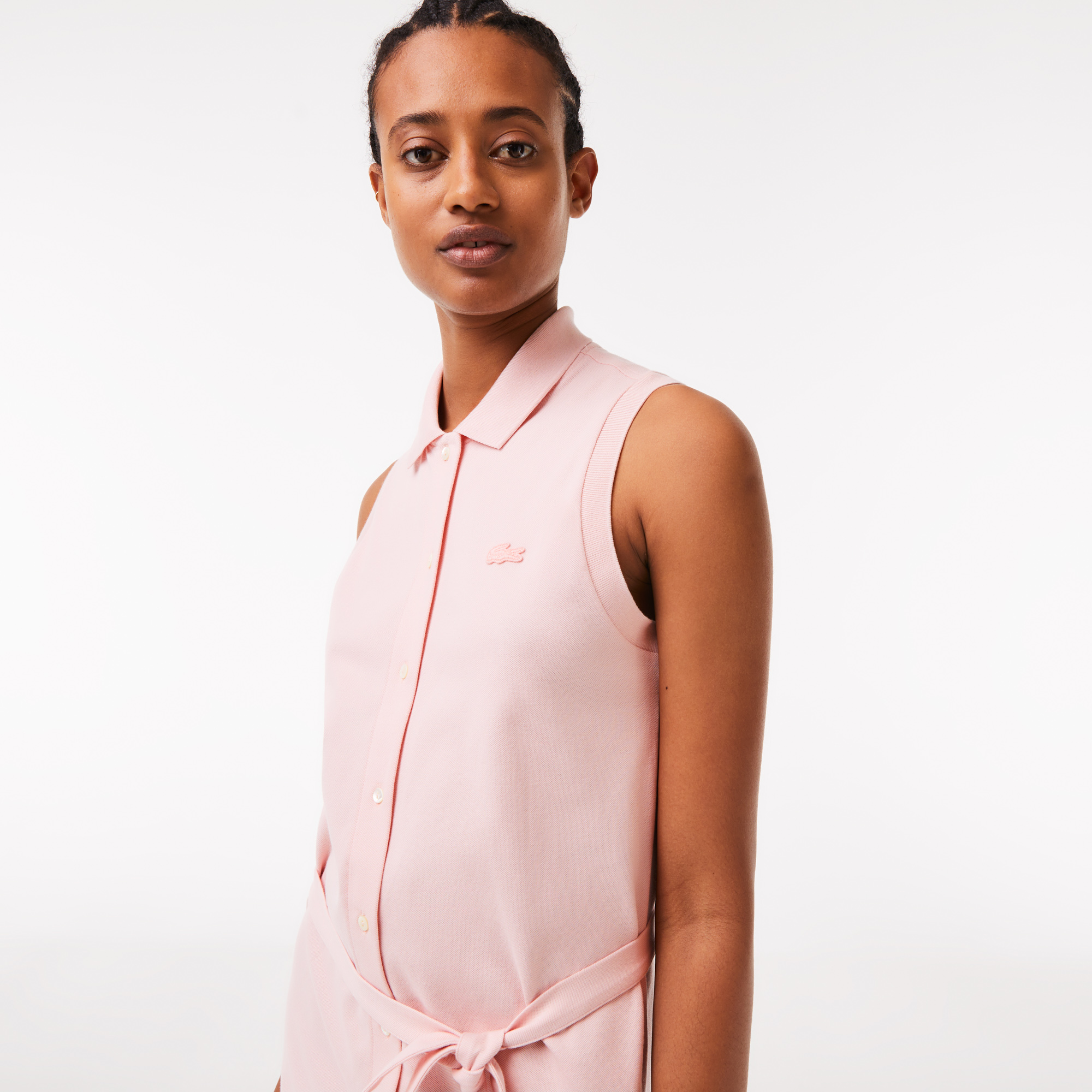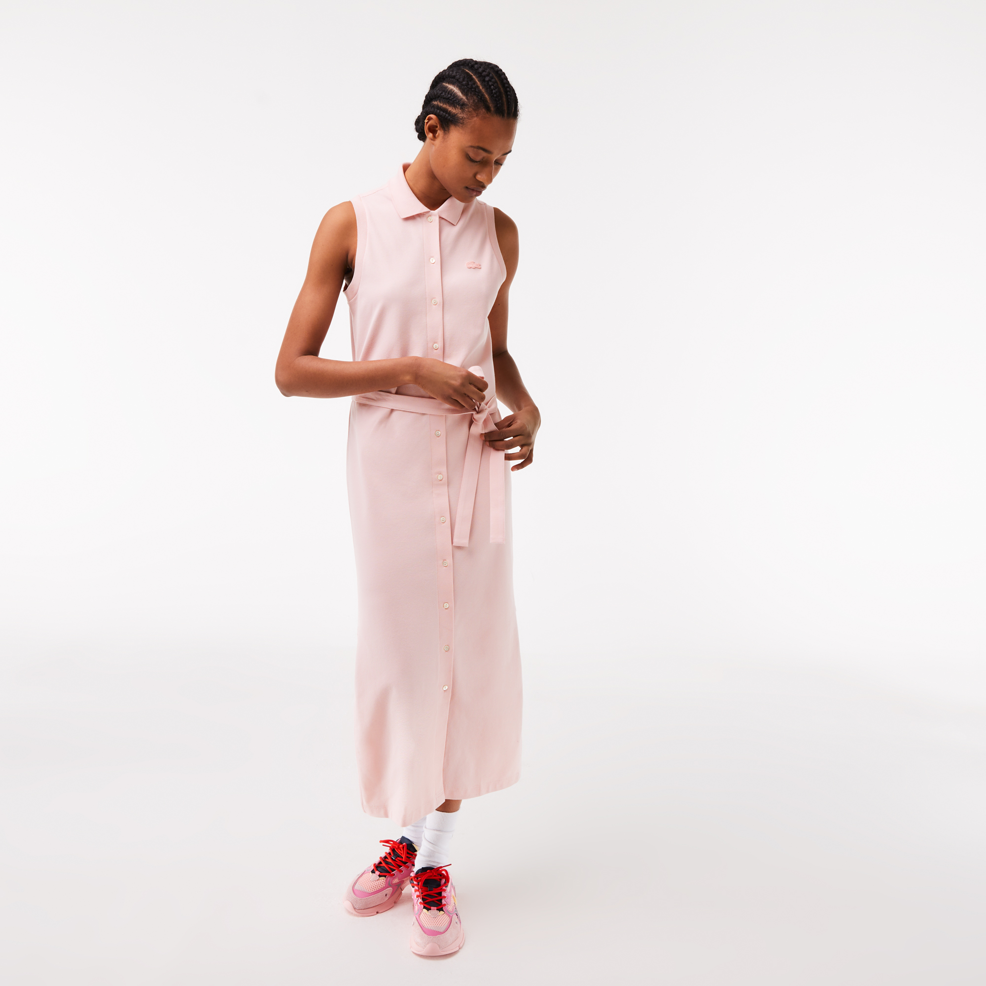 Длинное стрейчевое платье-поло Petit Piqué \ Стрейчевое хлопковое платье-поло \ Обычный прямой крой \ Пояс-завязка на талии \ Пуговицы из натурального перламутра \ Вышитый логотип на груди \ Воротник-поло с застежкой на перламутровые пуговицы\Мини-хлопк
