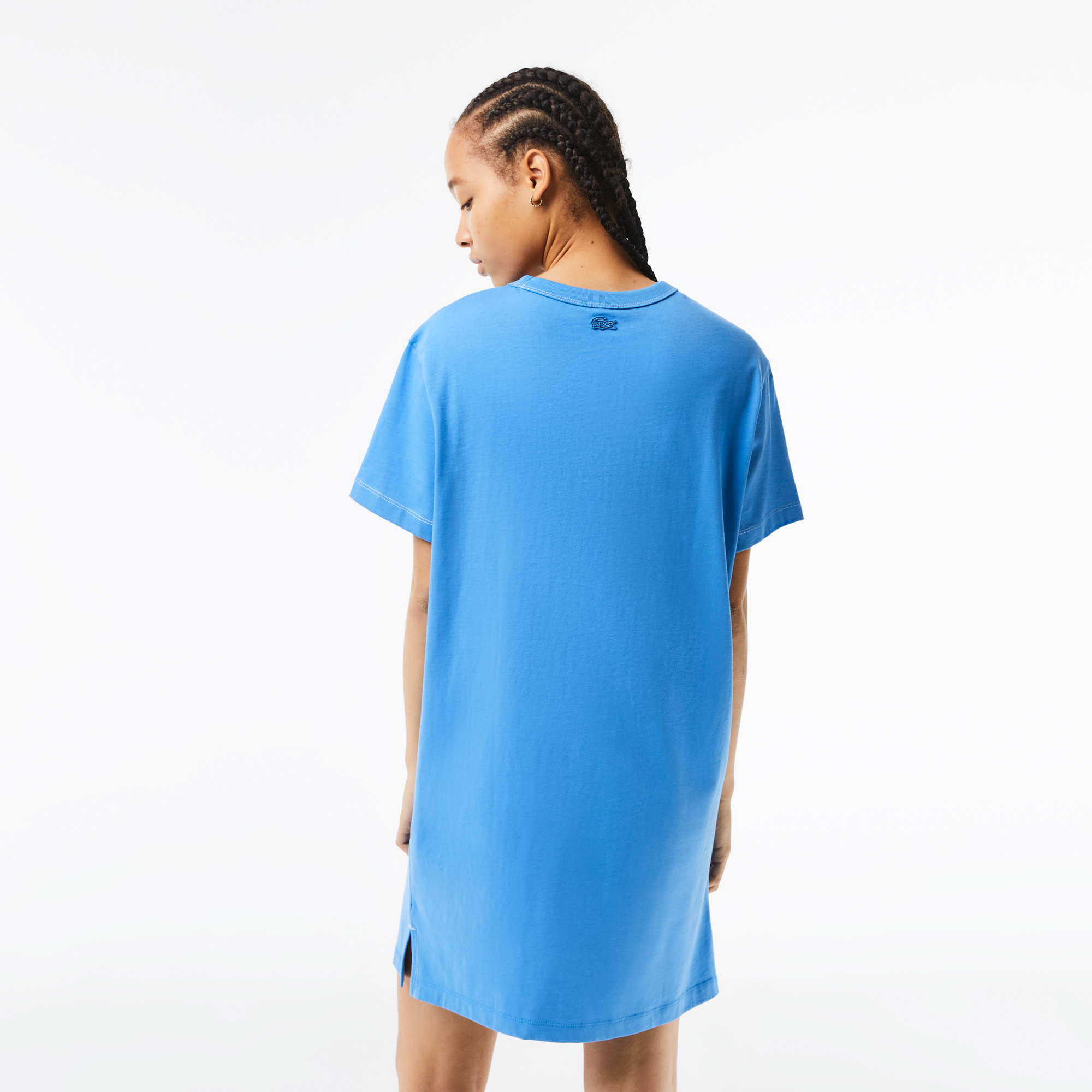 Женское платье-футболка из органического хлопка Lacoste с принтом \ Свободный, удобный крой со спущенными плечами \ Разрезы по бокам \ Текстурированный принт на груди \ Крокодил на груди \ Органический хлопок \ Это изделие имеет объемную посадку. Предпочи