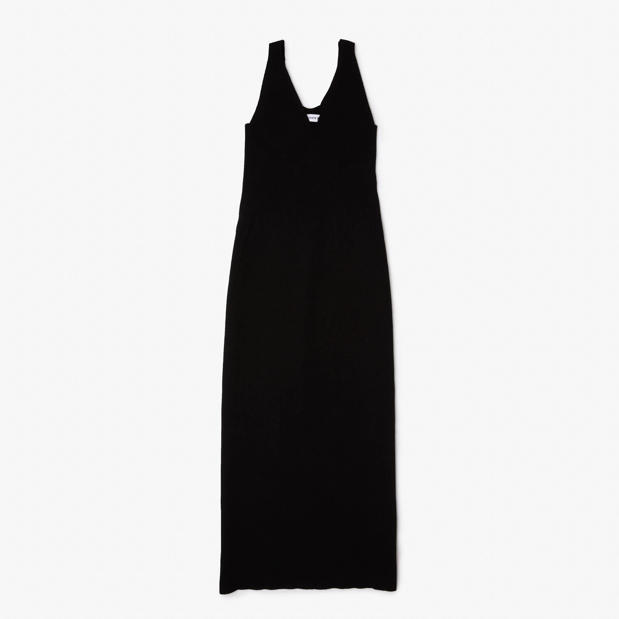 Женское трикотажное платье Миди без рукавов от Lacoste \ Приталенный крой \Логотип крокодила на уровне талии \ Тонкий ребристый трубчатый трикотаж \ V-образный вырез и разрез по бокам\Чистые, четкие линии\Материал: 70% вискоза 30% полиэстер