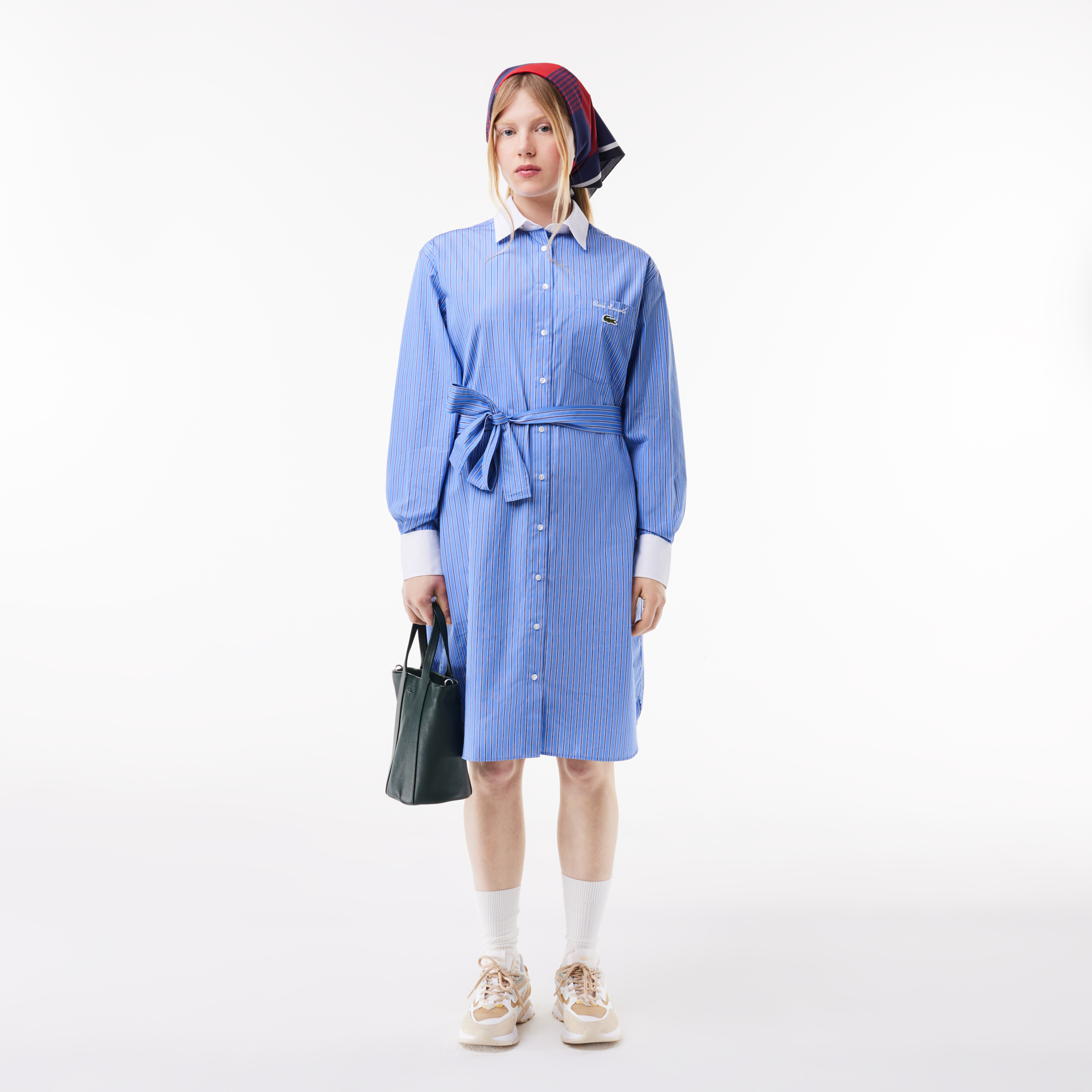 Платье из поплина в полоску свободного покроя \ Классический воротник \ Свободный крой \ Хлопковый поплин \ Комфортная складка на спине \ Вышитый логотип на груди \ Контрастный классический воротник и манжеты\Съемный пояс\В полоску\Хлопковый поплин\Удобн