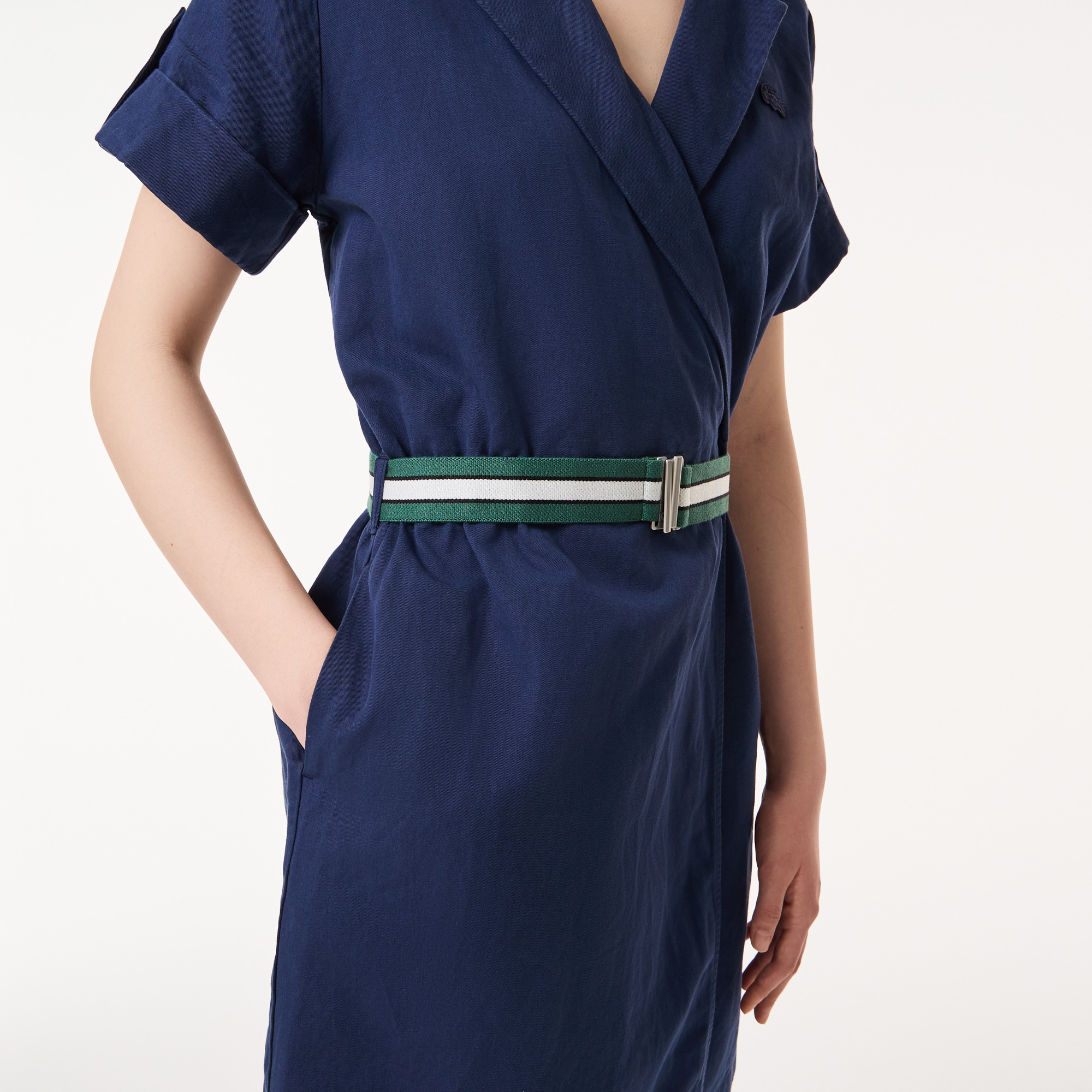 V-образный вырез\Короткие рукава\Контрастный пояс\Логотип в тон изделия\Материал: верх-50% хлопок 30% лен 20% тенсель\Рост модели 177 см, размер одежды 36
