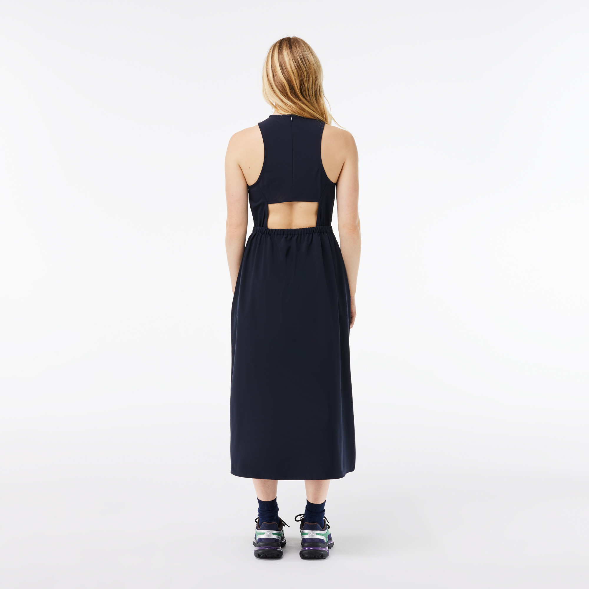 Платье без рукавов с открытой спиной \ Круглый вырез \ Длина до колен \ Невидимая молния сбоку \ Зигзагообразная деталь вокруг рук \ Логотип из силикона на груди \ Без рукавов\Круглый воротник\Длина до колен\Невидимая молния сбоку и на спине\Вырез на спи