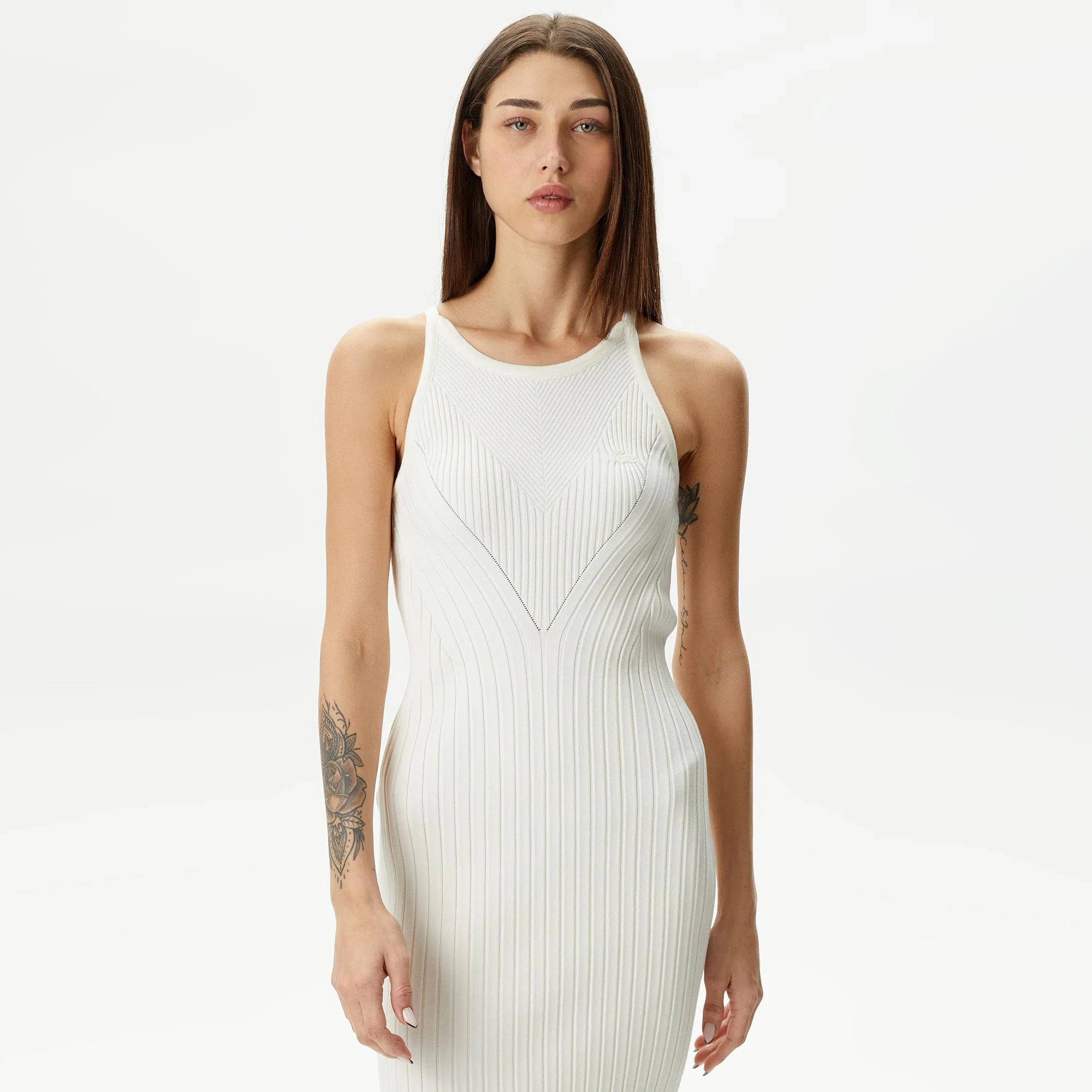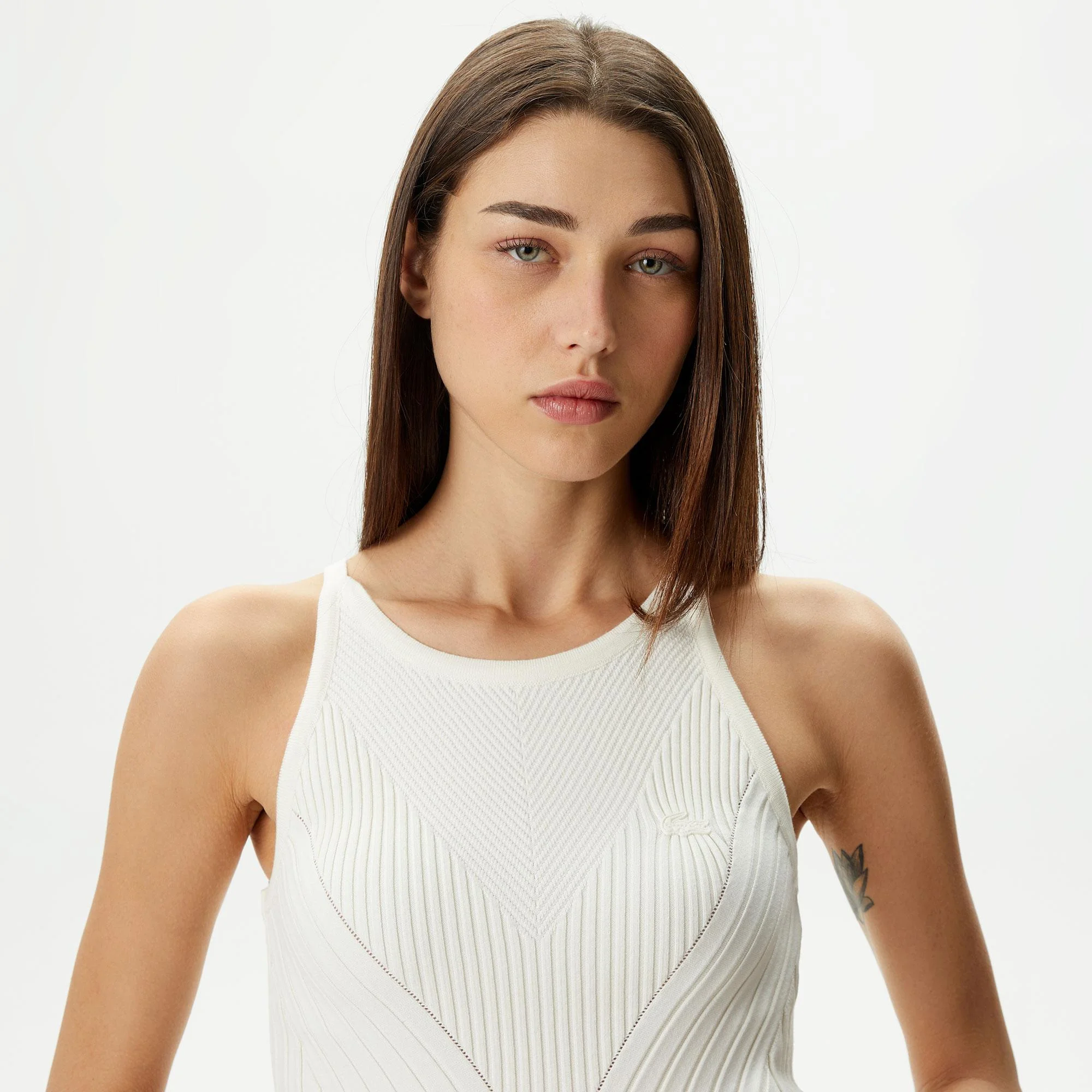 В крупный рубчик\Без рукавов\Логотип в тон изделия\Материал: 70% вискоза 30% полиэстер\Рост модели 174 см, размер одежды 36
