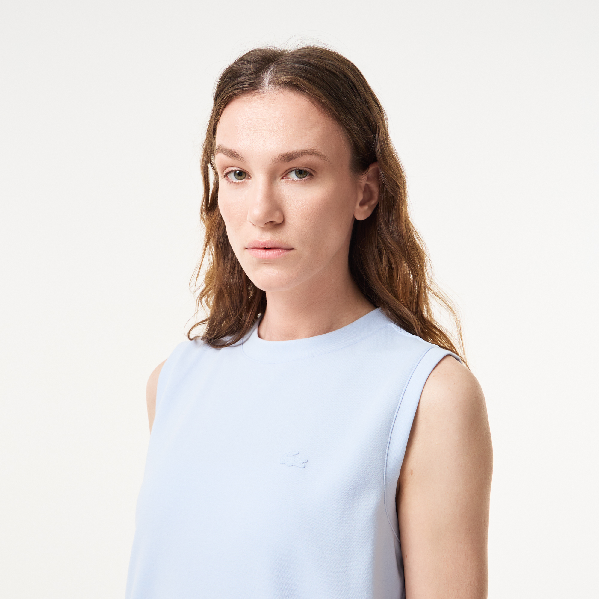 Круглый воротник\Без рукавов\Логотип в тон изделия\Материал: верх-48% полиэстер 46% хлопок 6% эластан\Рост модели 177 см, размер одежды 36