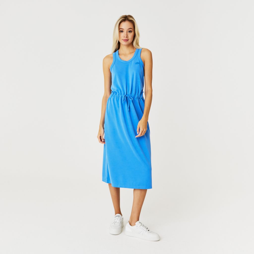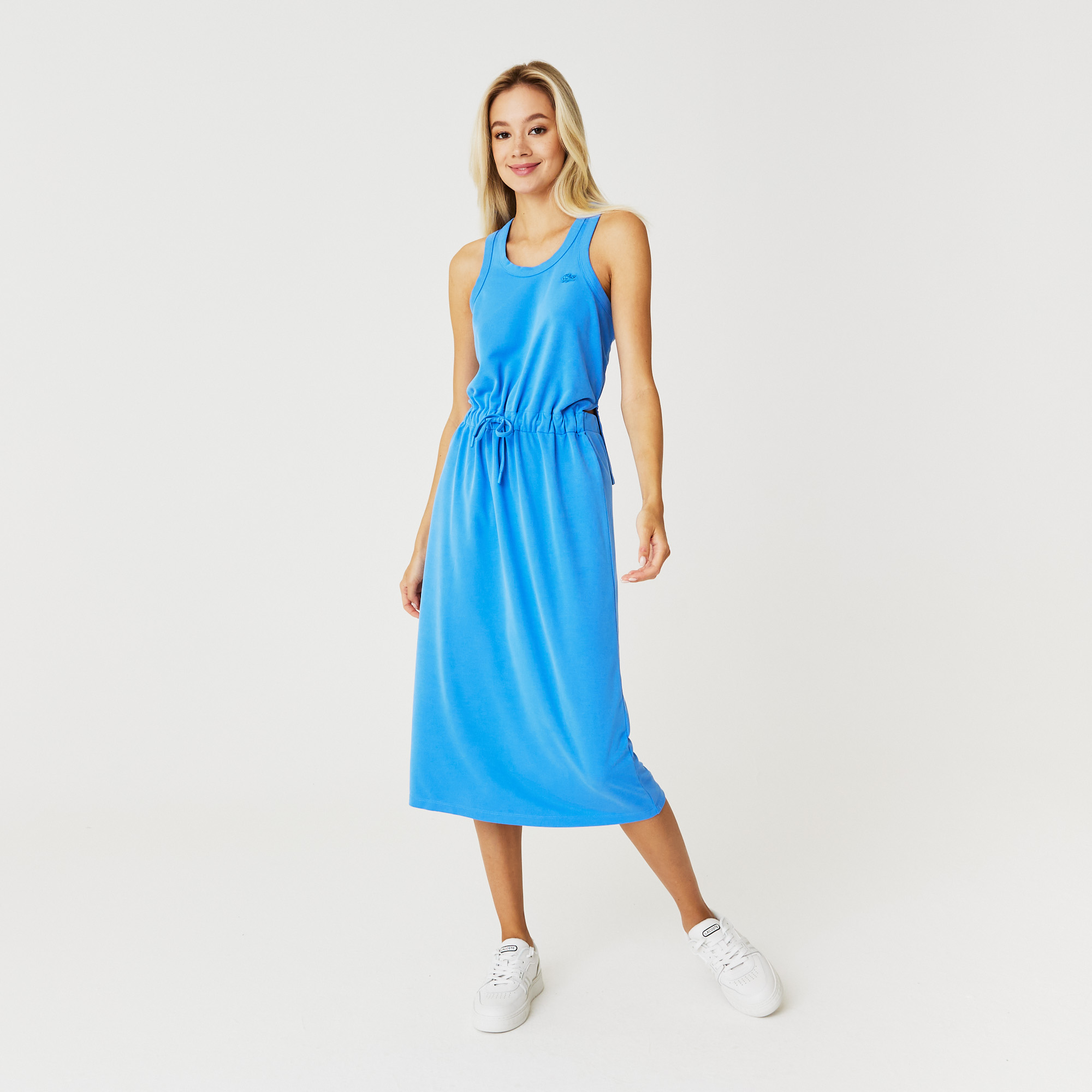 Регулируемая талия на шнуровке\Круглый вырез\Без руковов\Вышитый логотип в тон изделия на груди\Материал: 65% модал 35% полиэстер\Рост модели 175 см, размер одежды 36