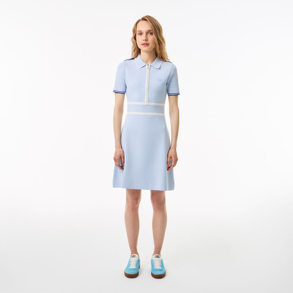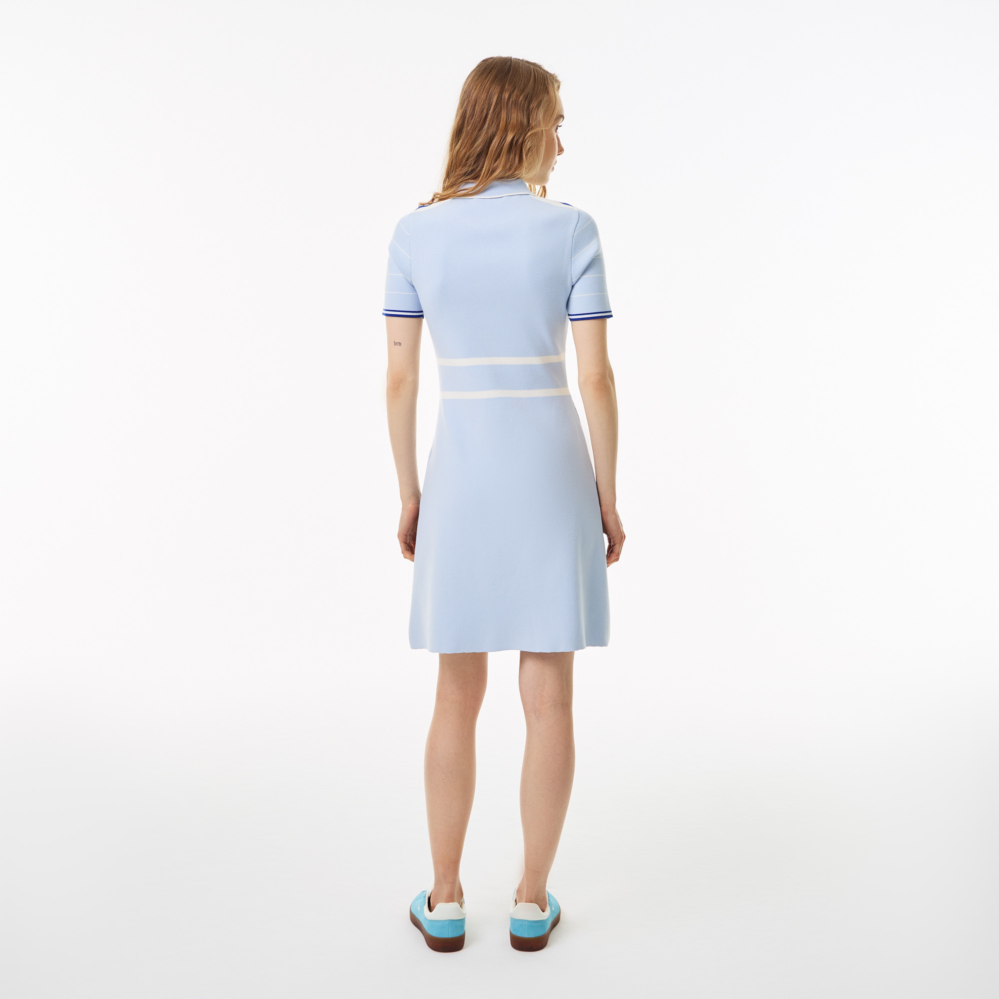 А-силуэт\Контрастный воротник-поло на молнии\Контрастные полосы\Логотип в тон изделия на груди\Материал: 70% вискоза 30% полиэстер\Рост модели 174 см, размер одежды 36