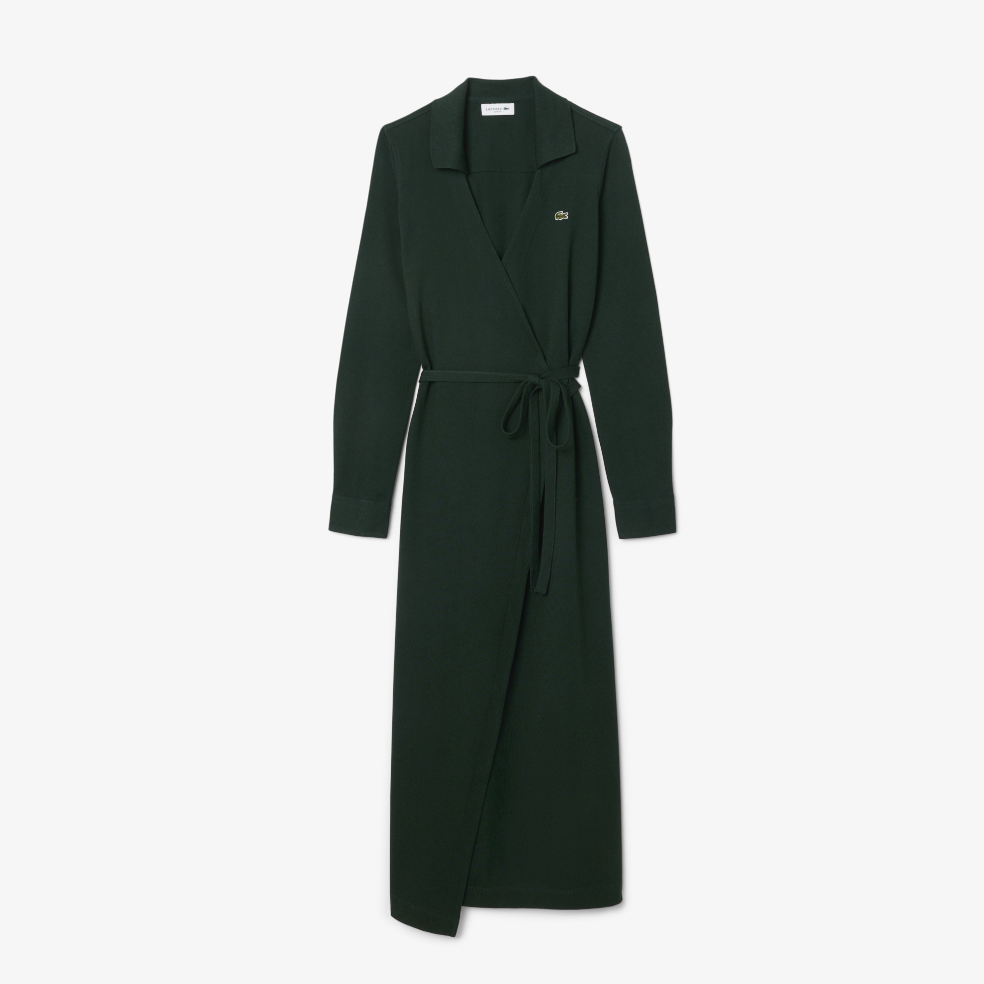 Приталенное платье-поло с запахом \ Эластичный хлопковый пике \ Приталенный крой \ Пуговицы из натурального перламутра на рукавах \ Открытый воротник в рубчик \ Вышитый логотип на груди \ Общая длина платья: 48 дюймов / 122 см для размера 36 \ Материал: