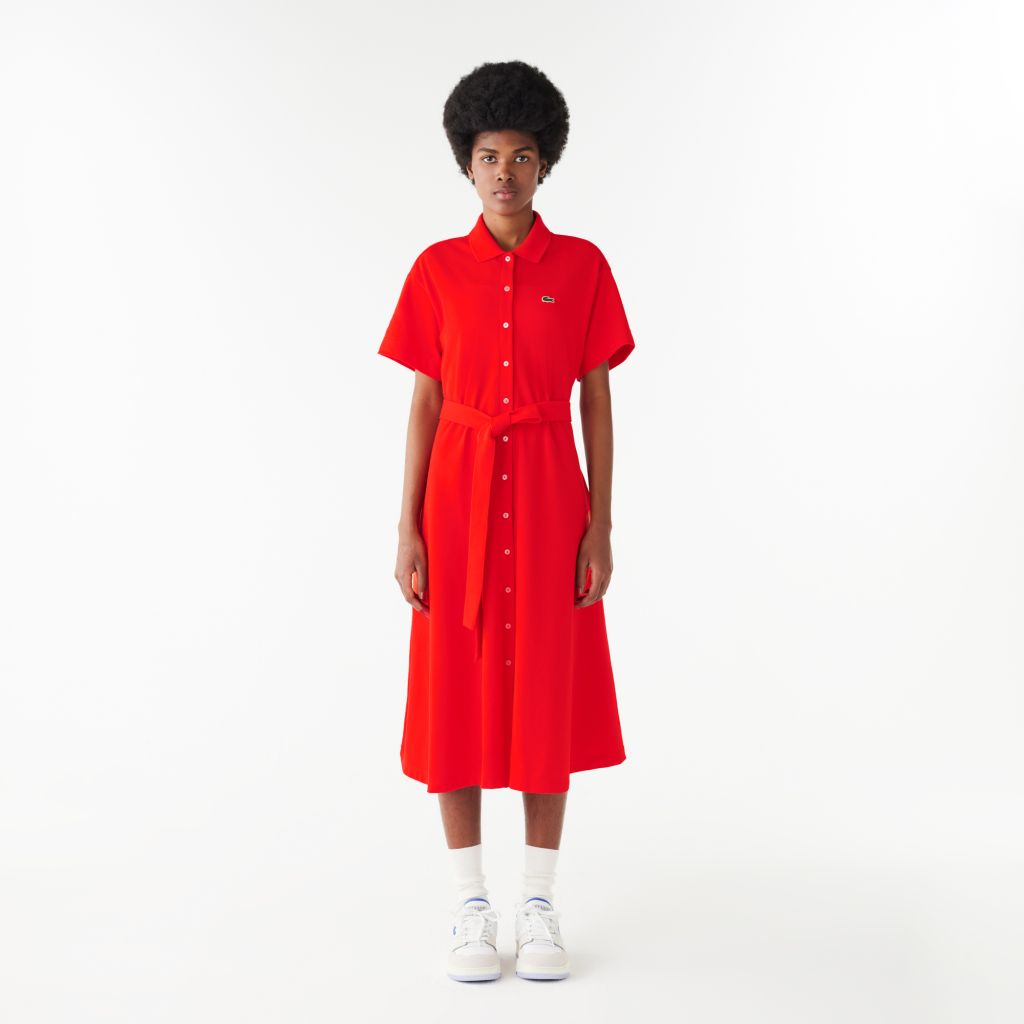 Платье-пике свободного покроя с поясом \ Эластичное, дышащее хлопковое платье-пике