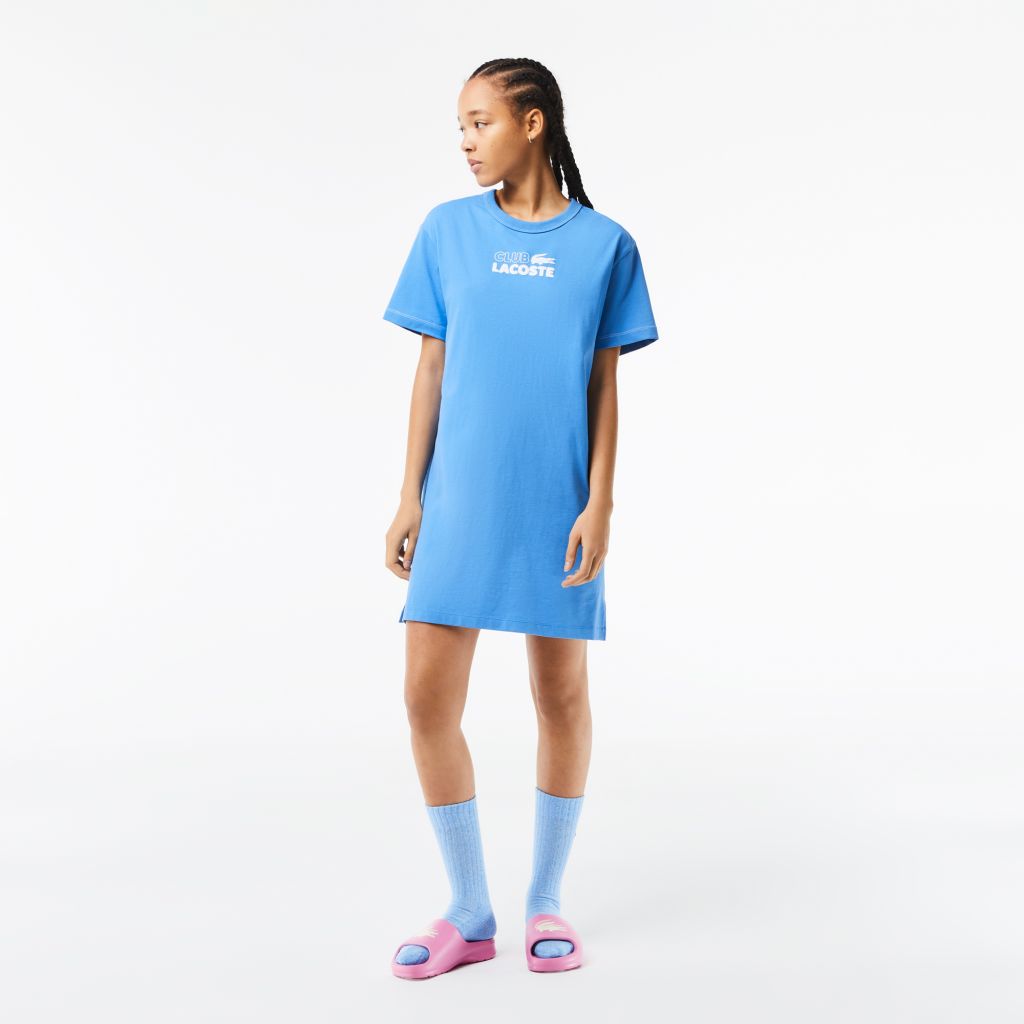 Женское платье-футболка из органического хлопка Lacoste с принтом \ Свободный, удобный крой со спущенными плечами \ Разрезы по бокам \ Текстурированный принт на груди \ Крокодил на груди \ Органический хлопок \ Это изделие имеет объемную посадку. Предпочи