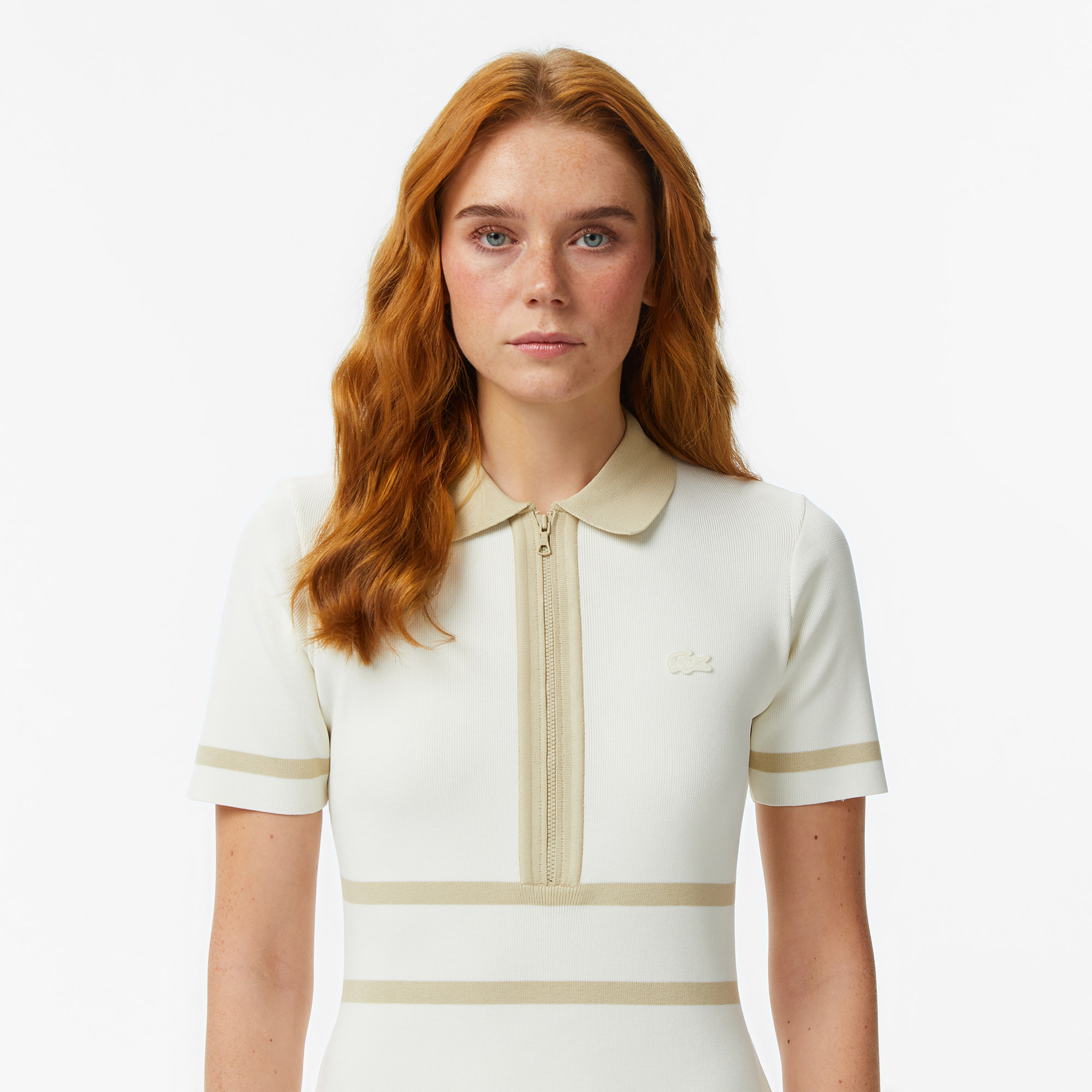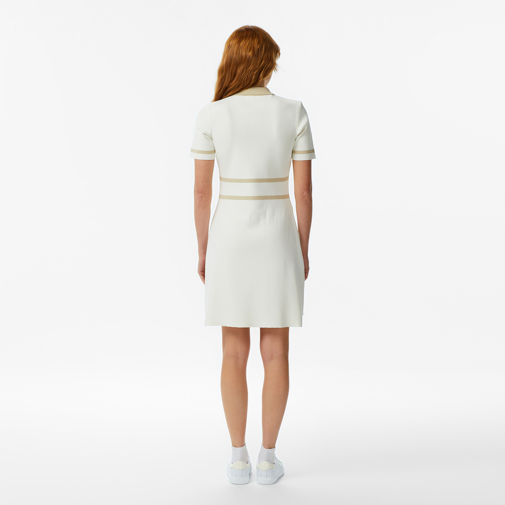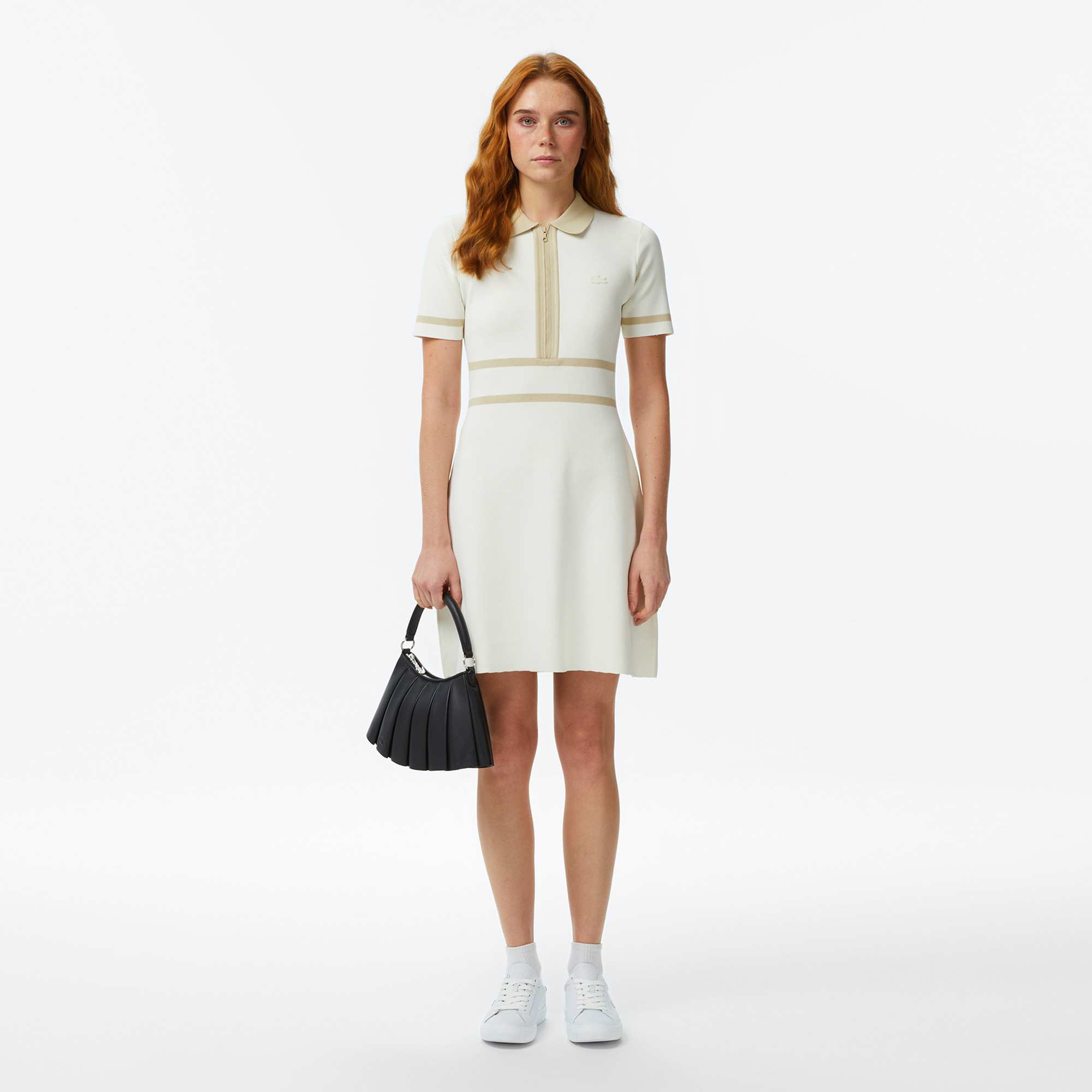А-силуэт\Контрастные полосы\Короткие рукава\Классический воротник\Молния на груди\Материал: 99% полиэстер 1% эластан\Рост модели 175 см, размер одежды 36