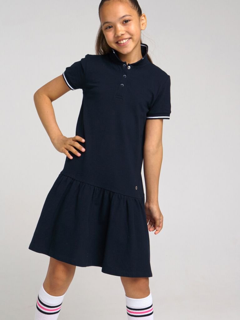 Школьное платье-поло для девочки подростка. Синее платье из трикотажного полотна пике идеально в школу. Платье для школы выполнено из ткани с высоким содержание хлопка 95%. Благодаря наличию эластана в составе ткани платье проще в уходе и отлично держит форму, что удобно для школьницы. Планка на кнопках.