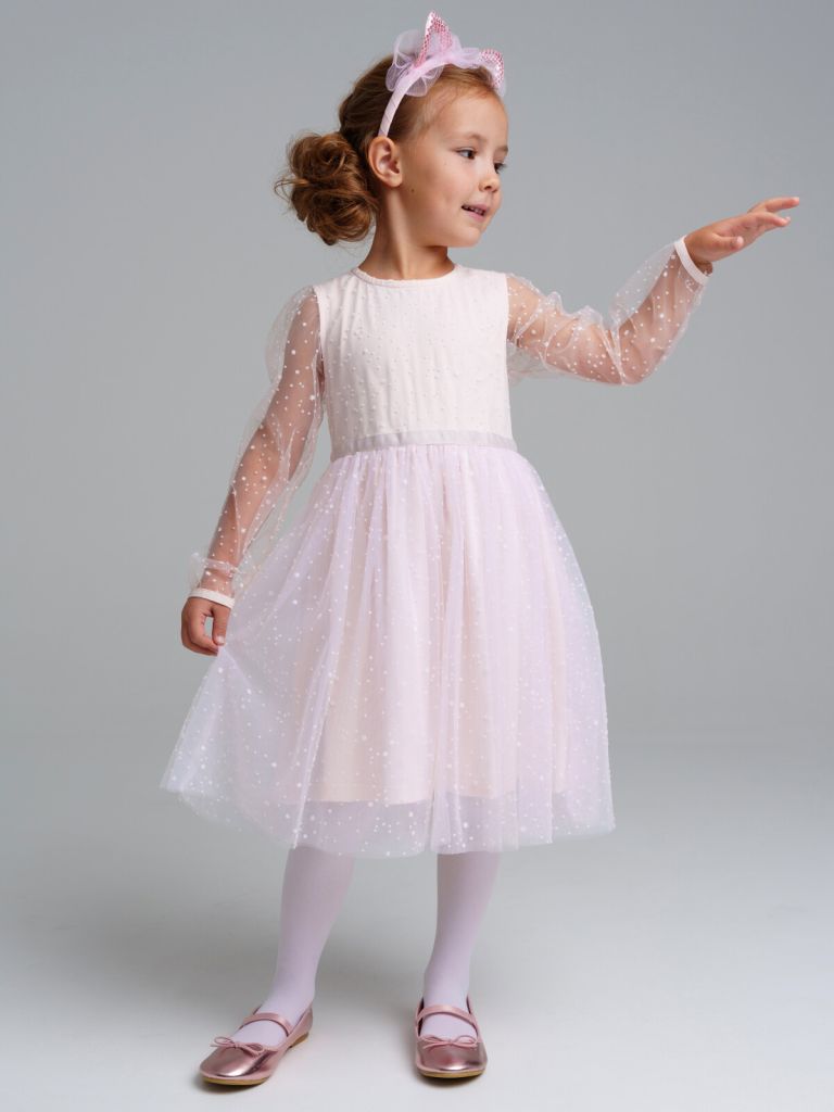 Платье трикотажное с юбкой и рукавами из мягкой сетки. Верх платья из трикотажа с высоким содержанием хлопка 95%. Благодаря наличию 5% эластана в составе ткани изделие держит форму. Застежка сзади на потайную молнию.