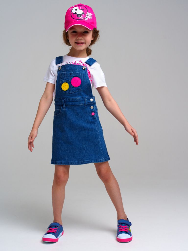 Сарафан джинсовый для девочки. Пояс на резинке с утяжкой, застежка на пуговицы.