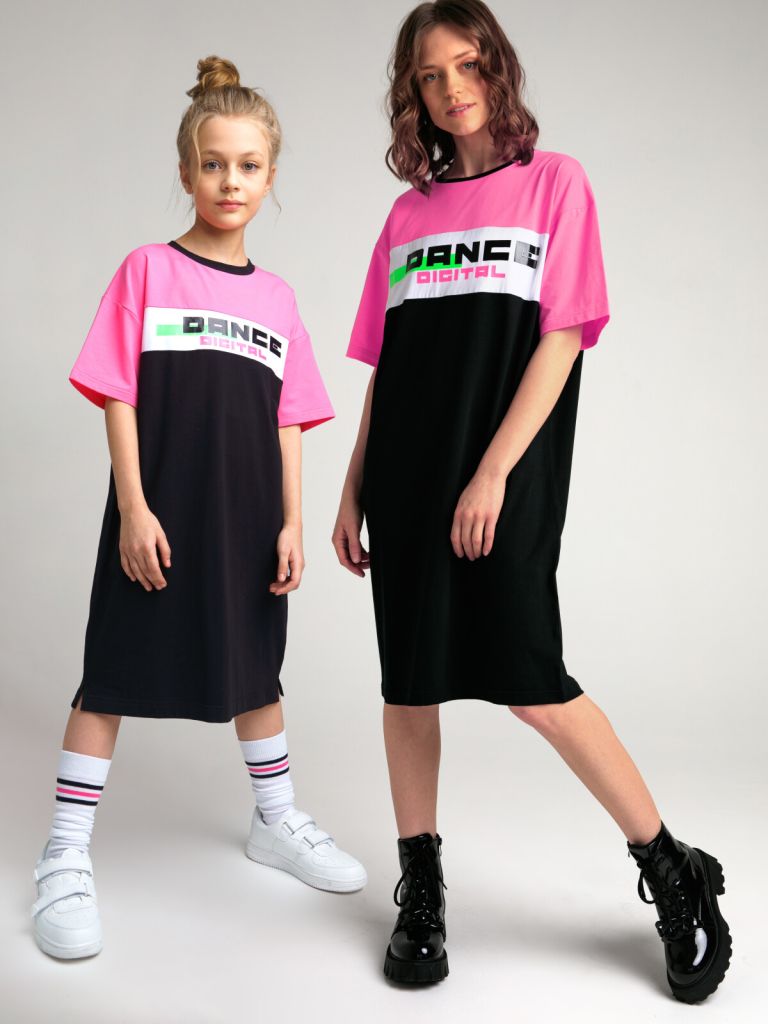 Платье-футболка из качественного и приятного на ощупь трикотажа джерси. Высокое содержание хлопка 95%. Благодаря наличию эластана в составе ткани изделие проще в уходе и держит форму. Принт сохраняет первоначальный вид даже после многочисленных стирок.