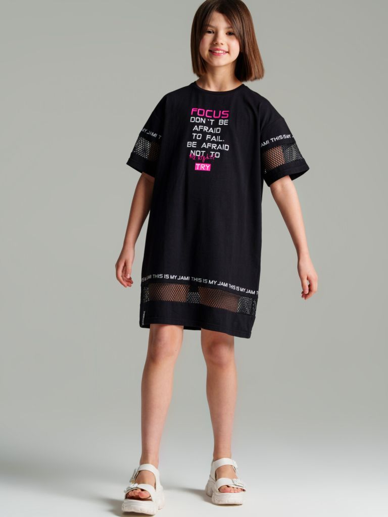 Платье oversize из качественного и приятного на ощупь трикотажа джерси. Высокое содержание хлопка 95%. Благодаря наличию эластана в составе ткани изделие проще в уходе и держит форму. Рукава и низ изделия декорированы сеткой.