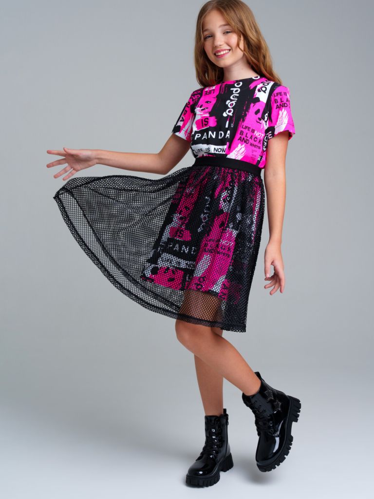 Oversize платье из качественного и приятного на ощупь трикотажа джерси. Высокое содержание хлопка 95%. Благодаря наличию эластана в составе ткани изделие проще в уходе и держит форму. Юбка из сетки с ластичным поясом по талии.