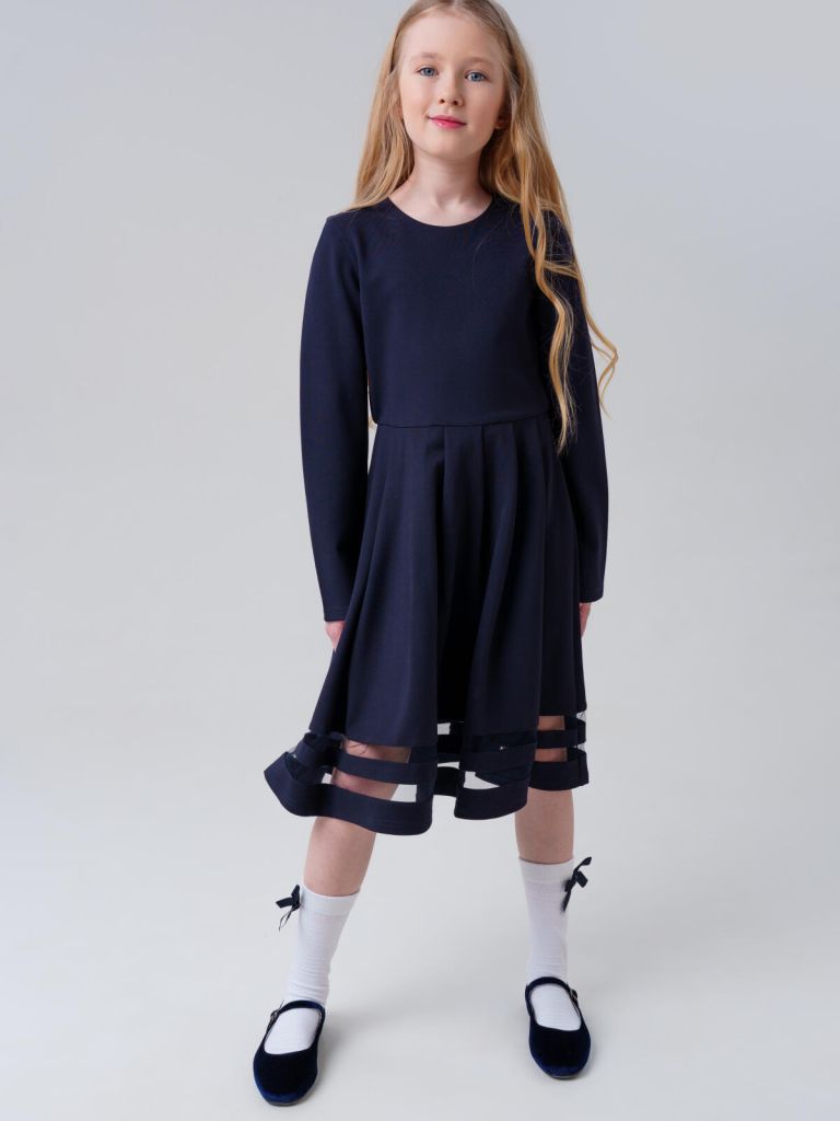 Модное тёмно-синее трикотажное платье в школу для девочки от PlayToday — это сочетание элегантности, практичности и комфорта на каждый учебный день!