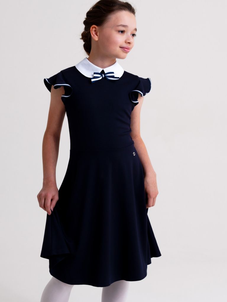 Классическое темно-синее школьное платье из трикотажа для девочки подростка от PlayToday — элегантная и удобная модель, созданная для школы. Свободный крой, мягкий материал и съёмный воротник делают это универсальное детское платье идеальным решением для учебных будней и особых школьных событий.